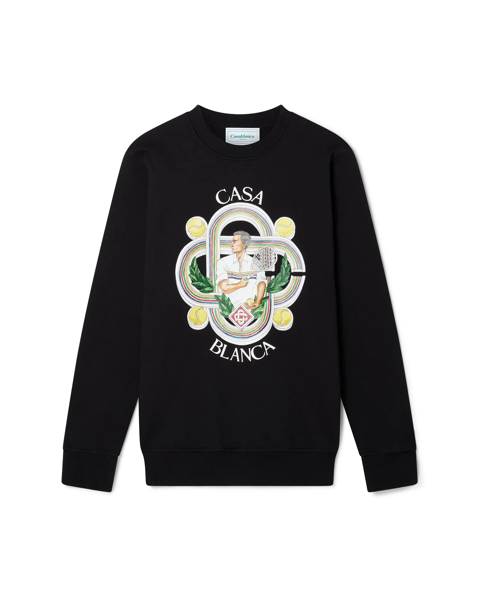 The Le Joueur screen-printed organic cotton black sweatshirt features seasonal artwork incorporating the house's signature tennis iconography. Completed with a classic crewneck, long sleeves and Casablanca Paris branded label, designed for a relaxed fit.