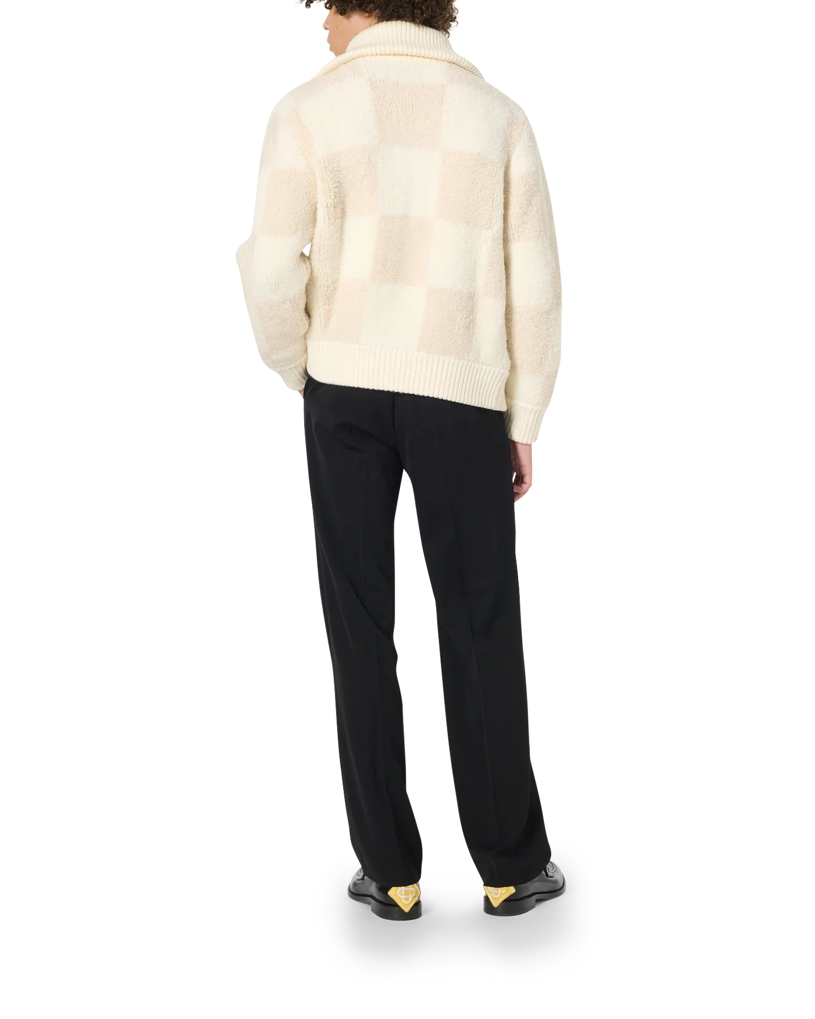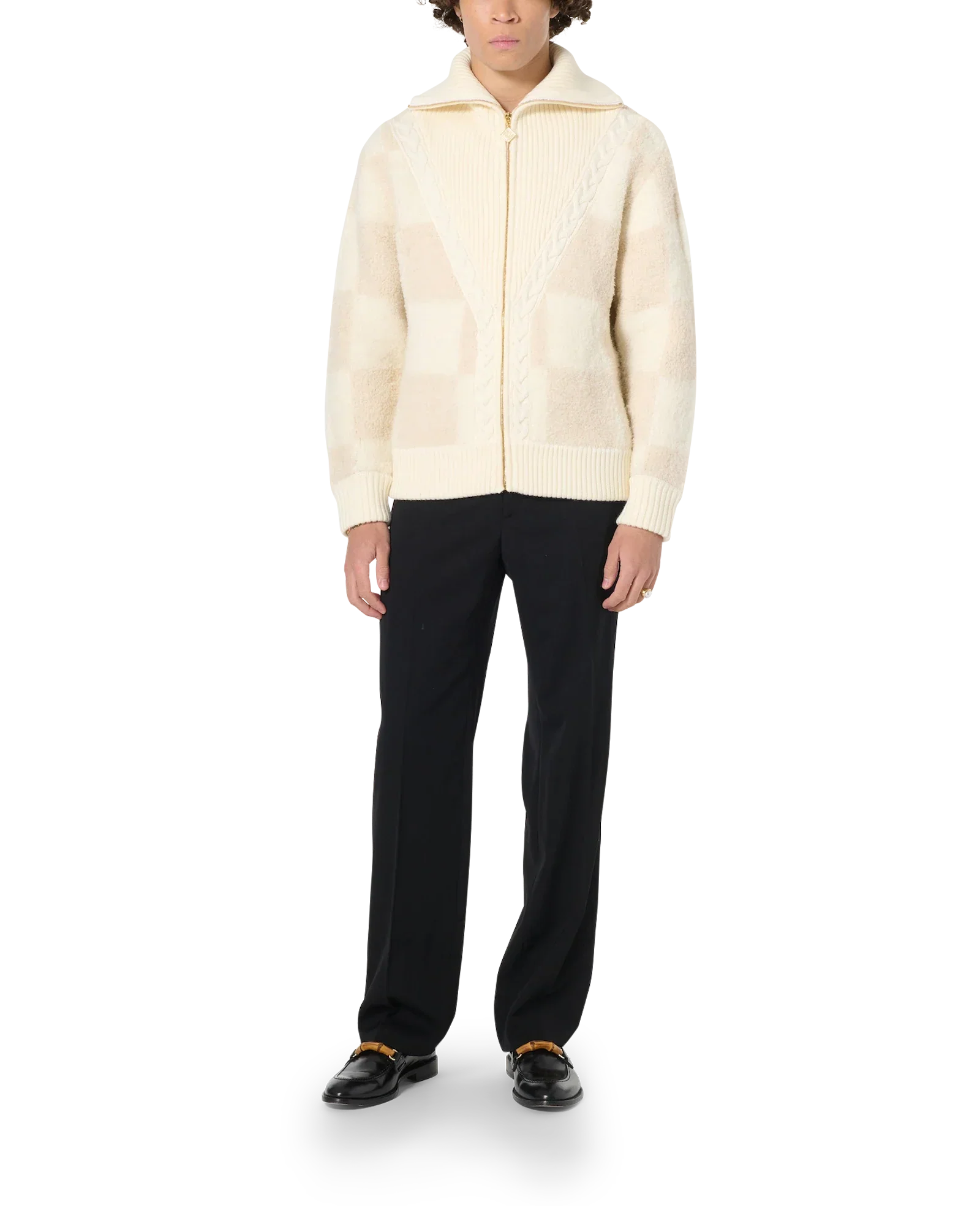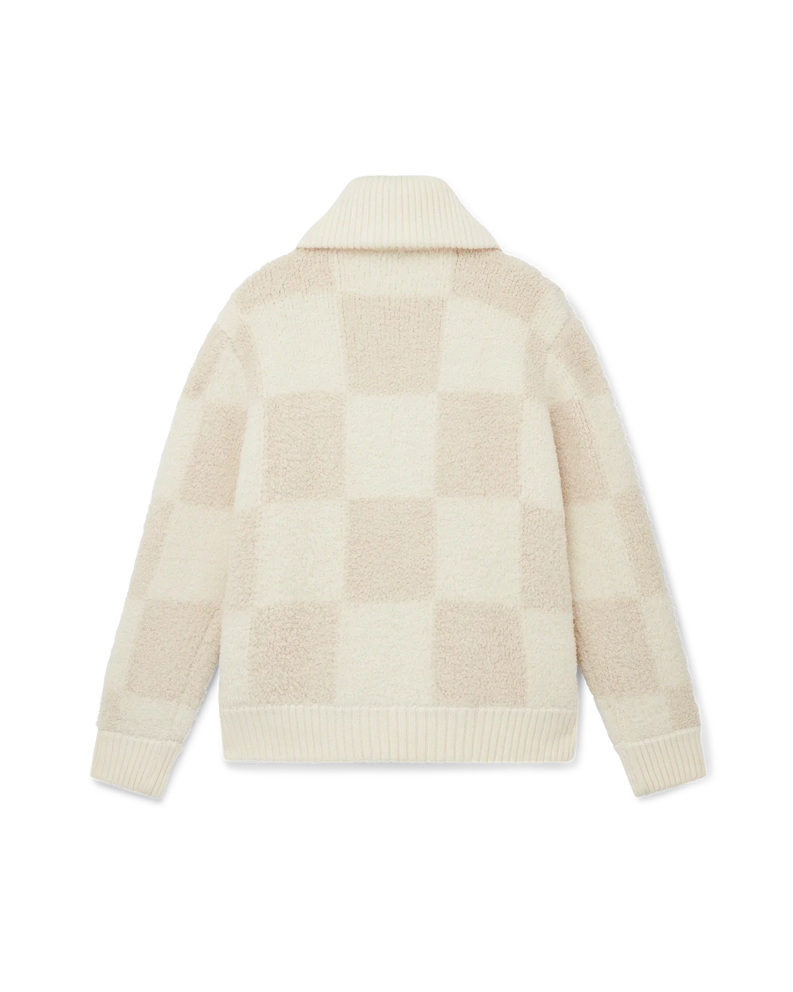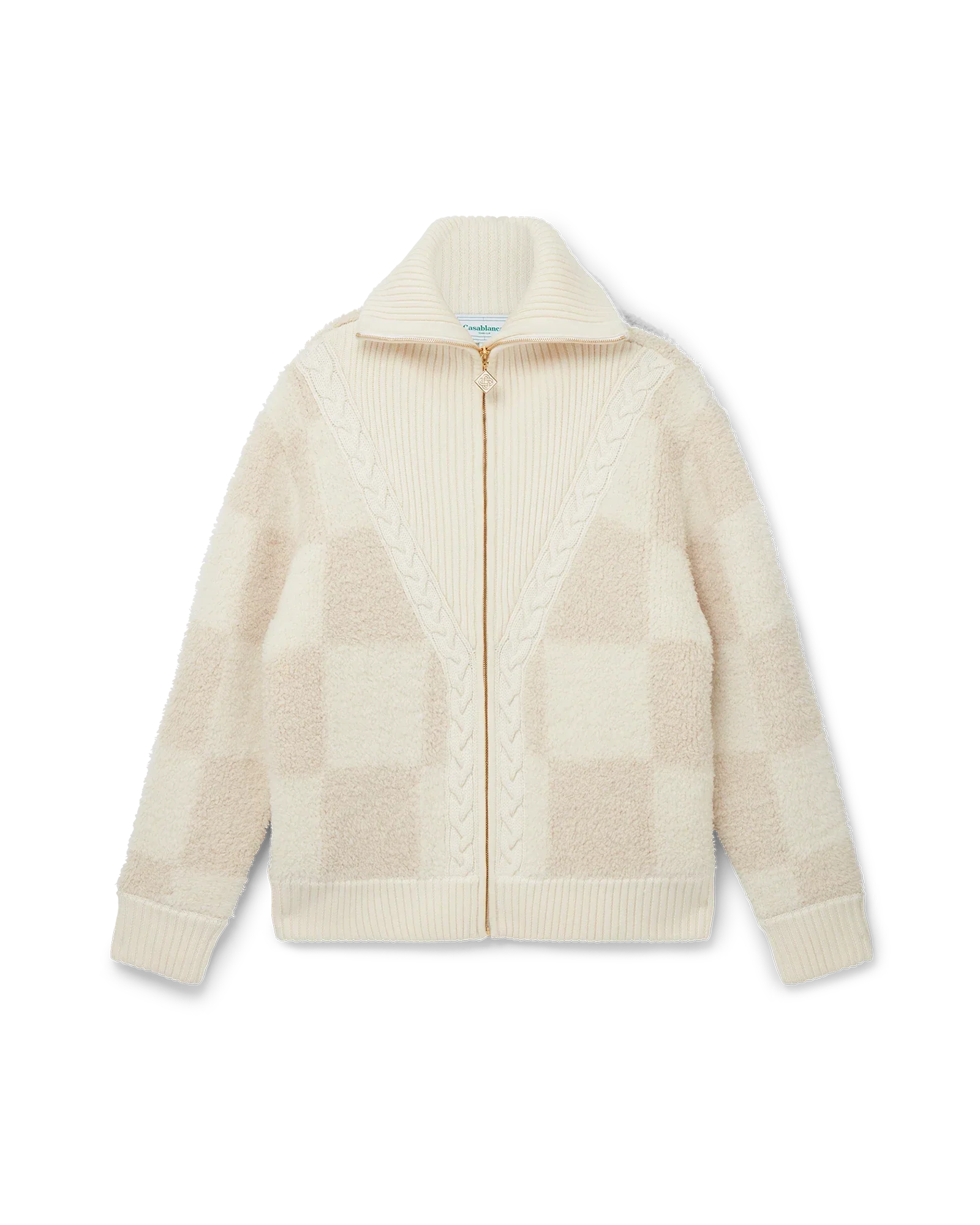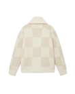 The checked boucle cardigan is a long-sleeve knit style featuring a checked block motif. Completed with a splayed collar, and gold hardware zip-up fastening and is designed for a relaxed fit.