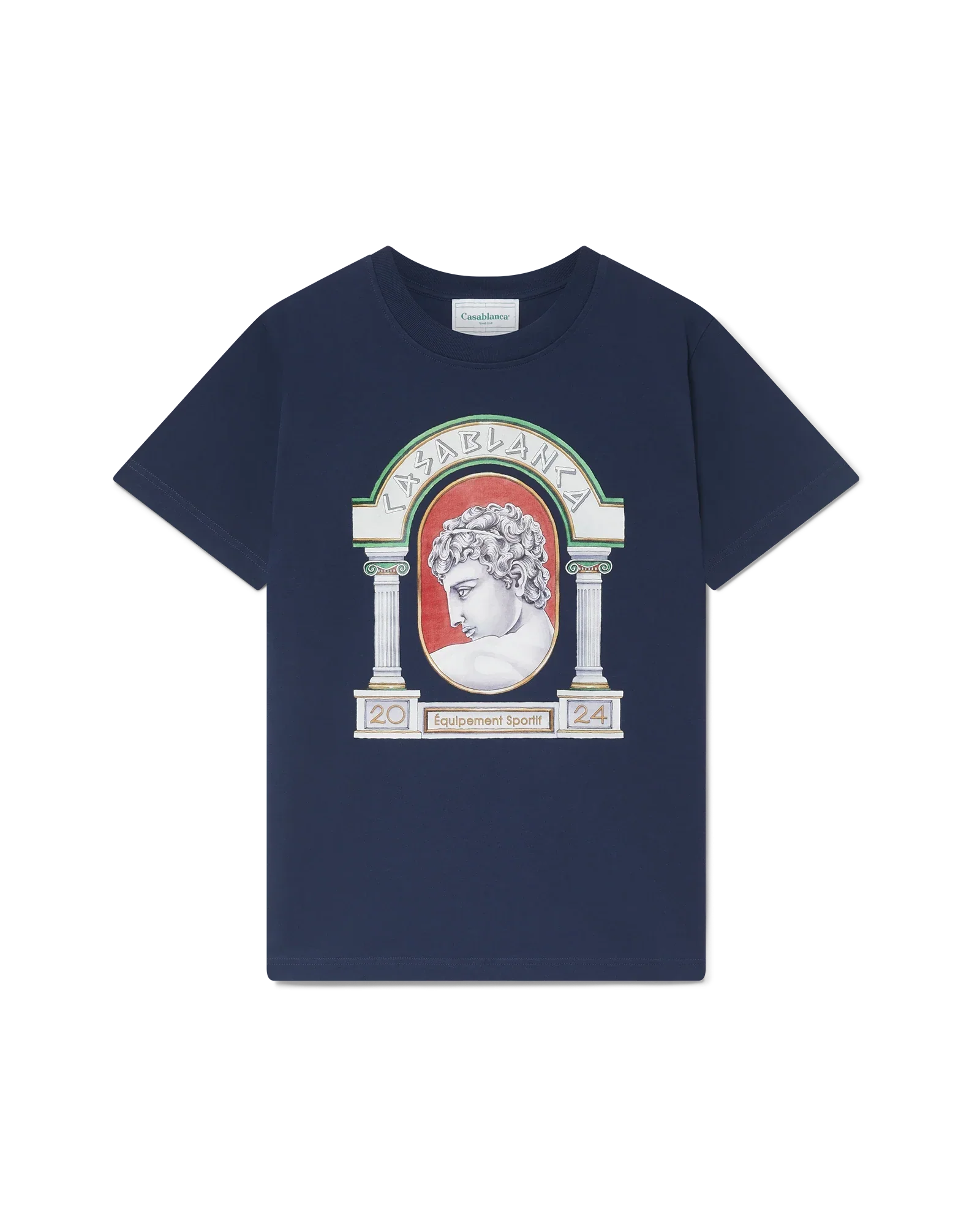 The La Medaille t-shirt is a short-sleeved printed design featuring the house's seasonal artwork, inspired by ancient Greece featuring the house's design element - the arch - depicting columns, a bust, and ancient Greek-style text. Completed with a finely ribbed classic crew neck.