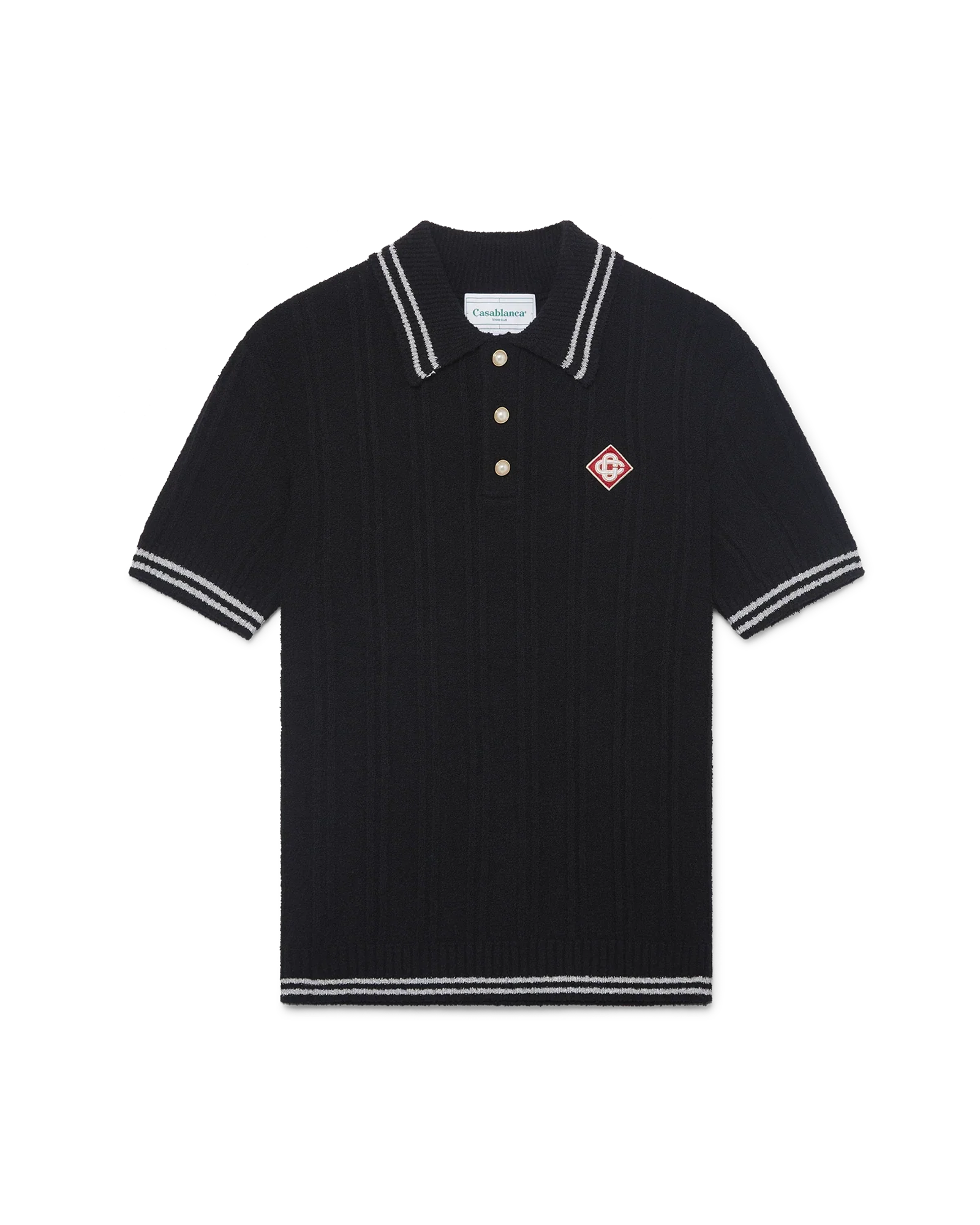 The silver trim boucle polo shirt is a short-sleeved design crafted from a cotton blend fabric featuring the house's signature diamond logo. Completed with the house's signature gold rim pearl buttons, edge detail on the collar and hem, and a rib collar, cuffs, placket, and hem.
