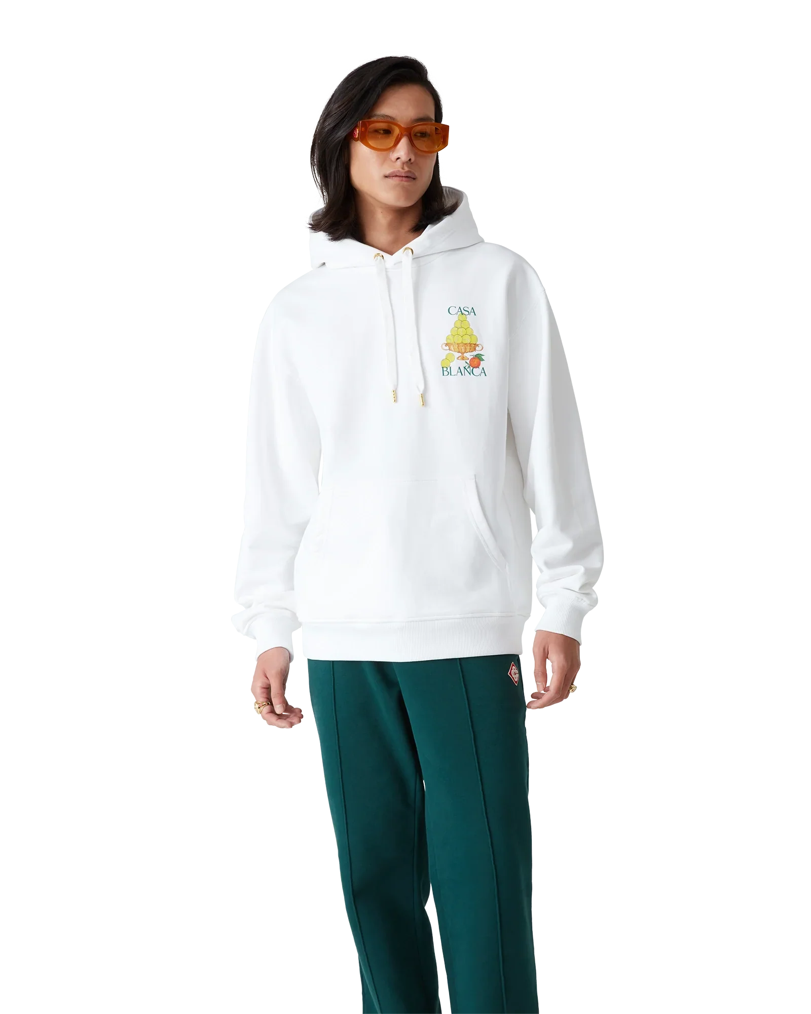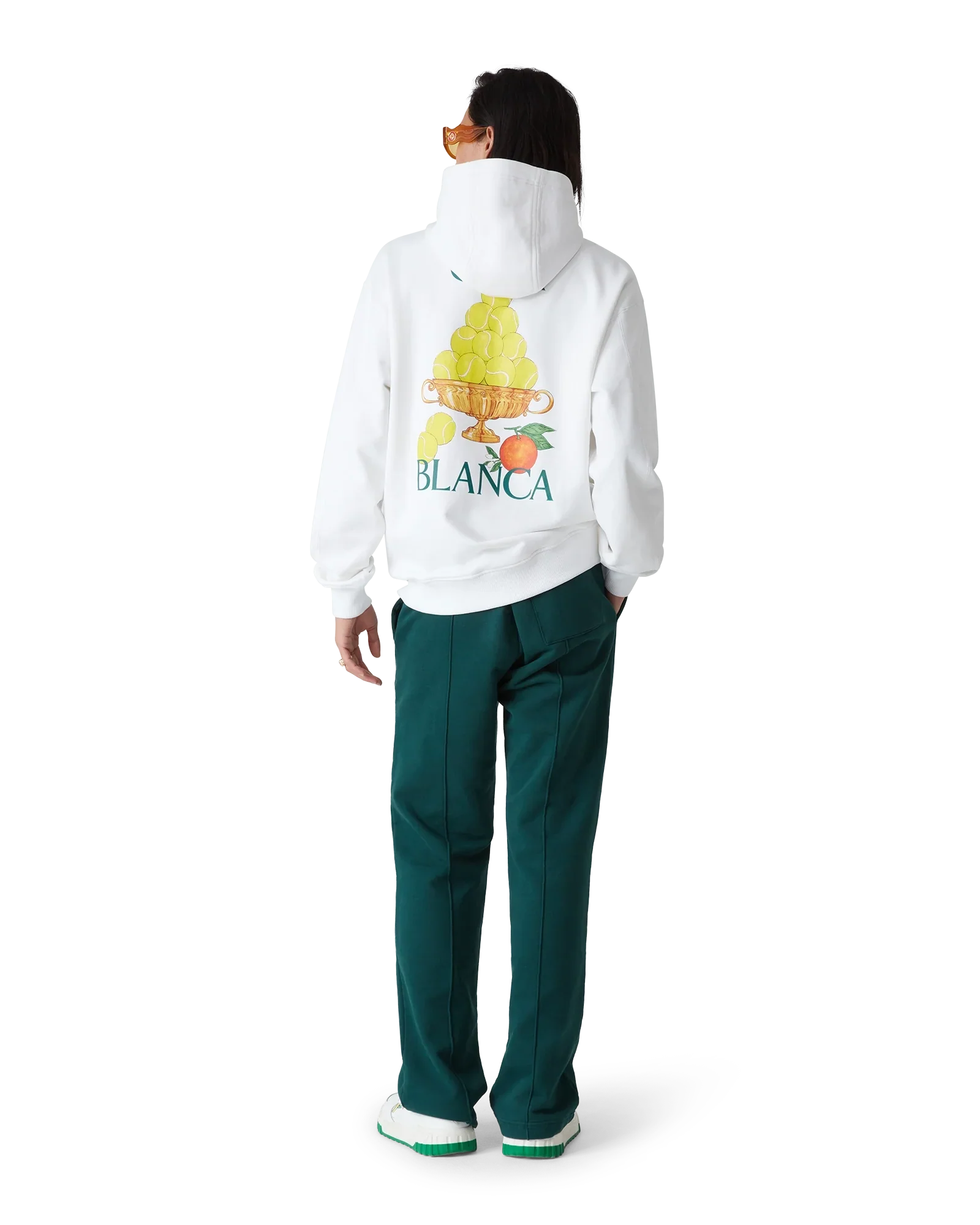 The Triomphe De Tennis hooded sweatshirt is a long-sleeve printed design featuring the house's signature artwork incorporating orange and our tennis ball pyramid on the chest and repeated in a larger print on the back. Crafted from organic cotton loopback fabric and completed with a hood with gold-plated eyelets, gold-tipped drawstring fastening, and rib cuffs and hem.