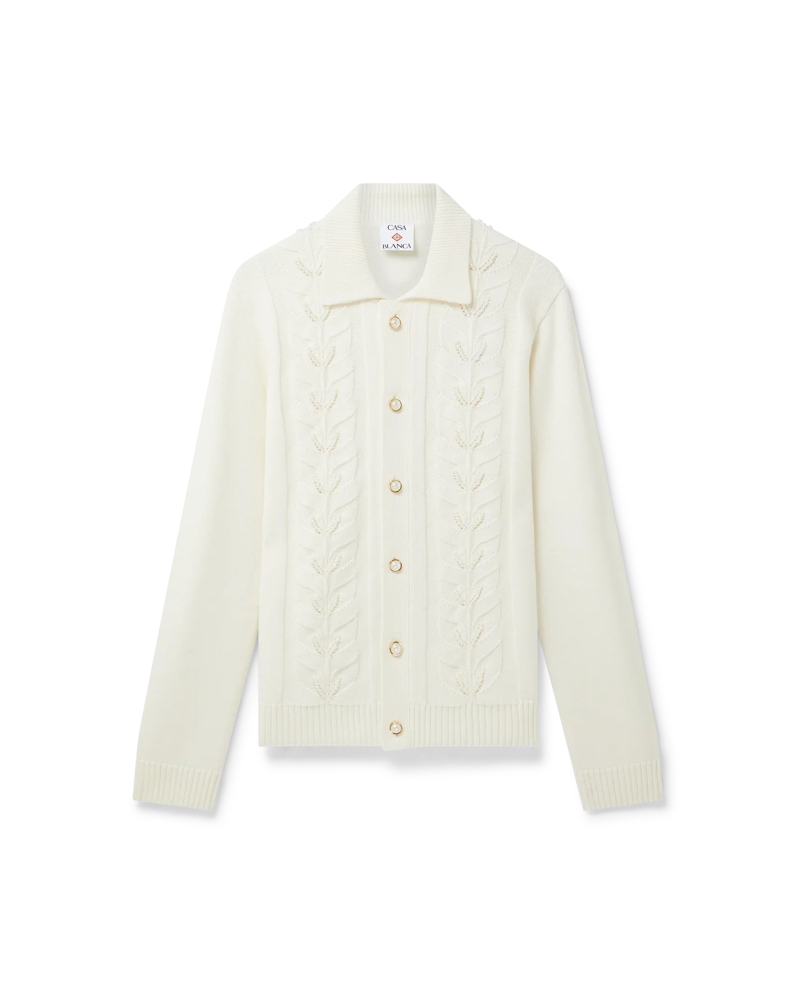 The Laurel knit cardigan is a long-sleeve design crafted from knitted merino wool fabric. Completed with button closure, signature gold rim pearl buttons, the house's signature Laurel artwork down the front, and rib cuffs, collar, and hem details.