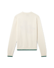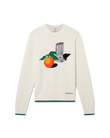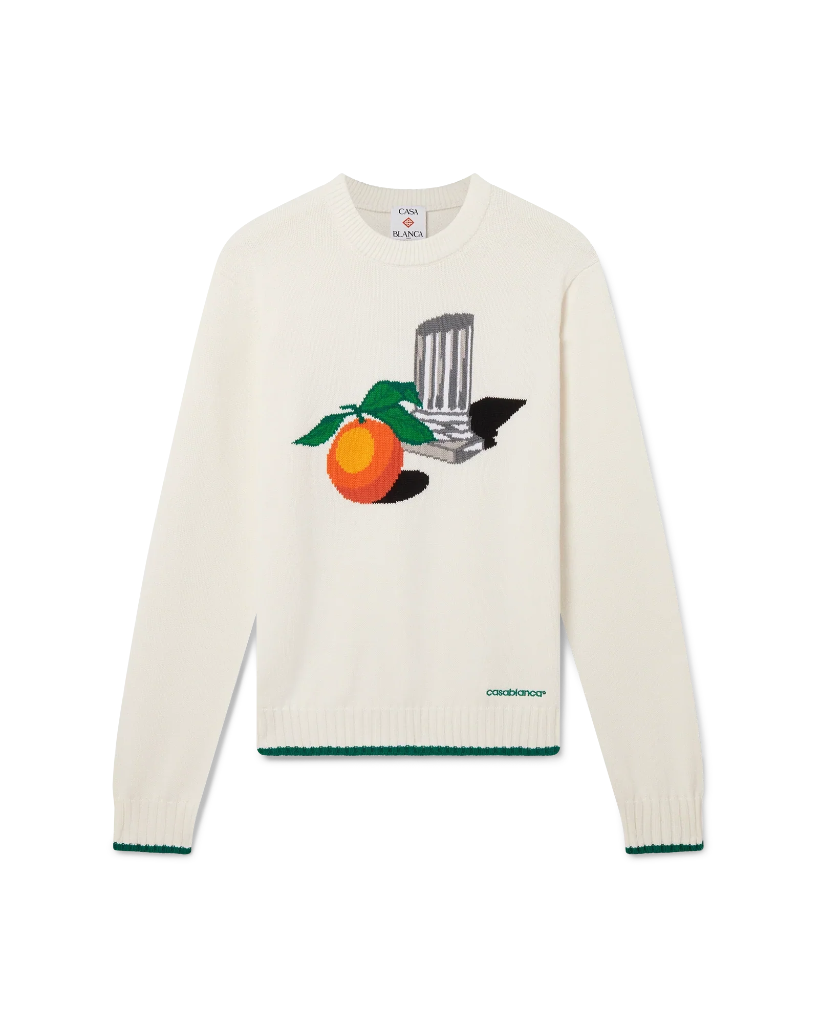 The intarsia jumper is a white long-sleeve knit design featuring the house's seasonal artwork inspired by Ancient Greece and the house's design element - the orange - crafted from breathable cotton fabric. The style is completed with a classic crew neck, rib collar, and cuffs and hem with contrast edge detail.