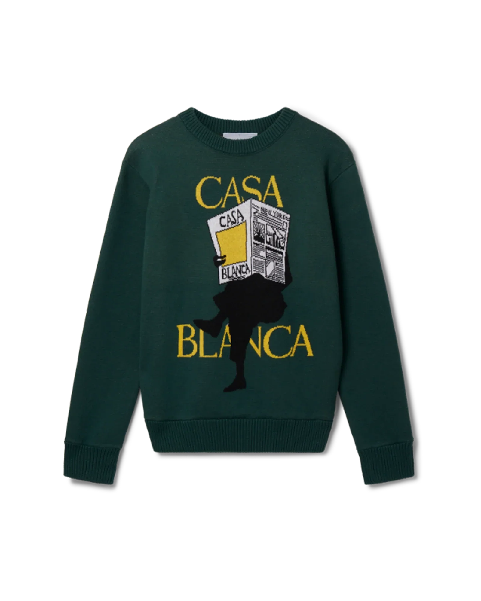 The Casa Times Intarsia Jumper is a long-sleeve knit style, crafted from a knitted cotton fabric and featuring the house's seasonal artwork. Completed with a classic crew neck, rib collar, cuffs and hem, and a Casablanca branded label.