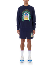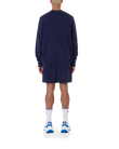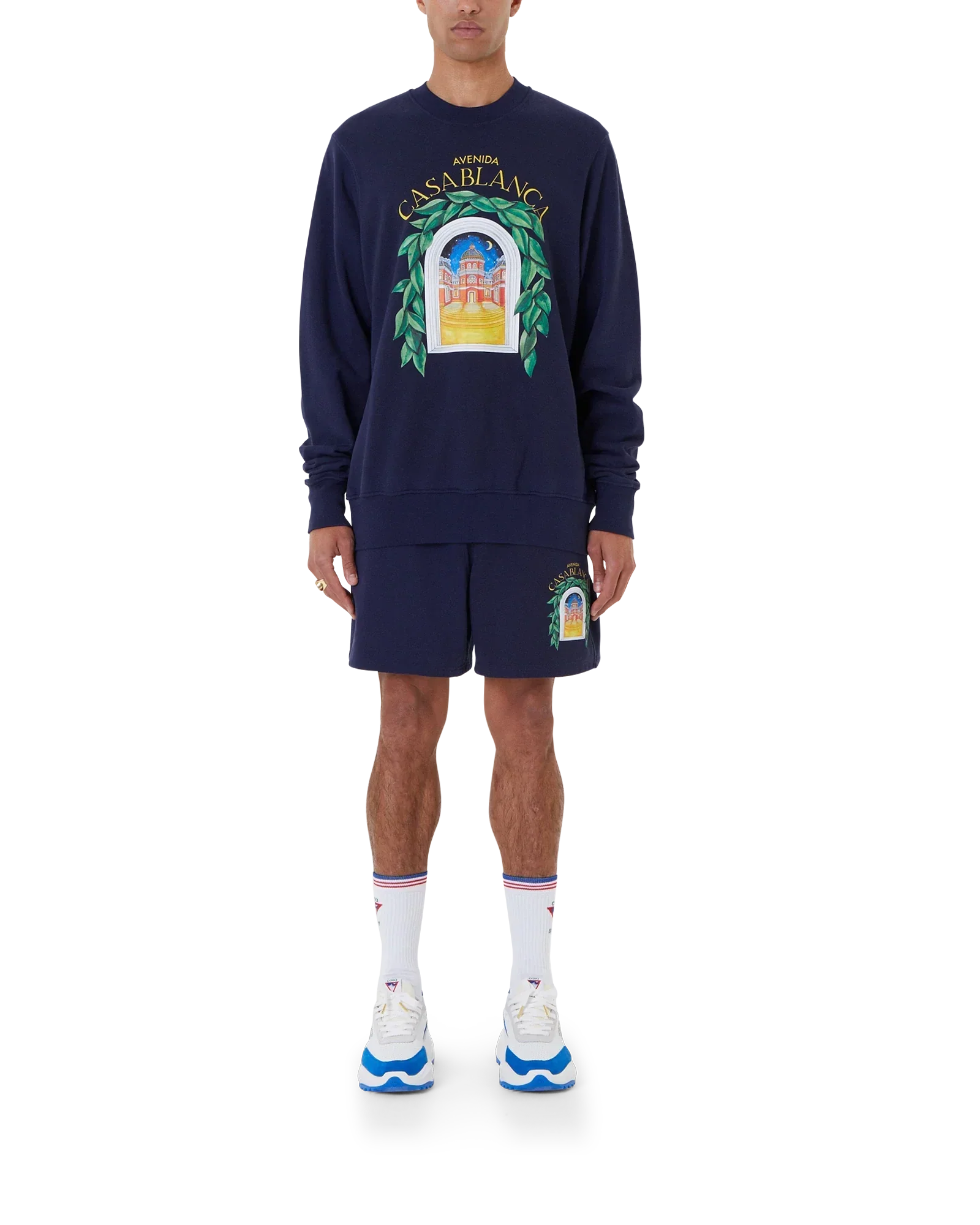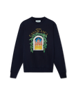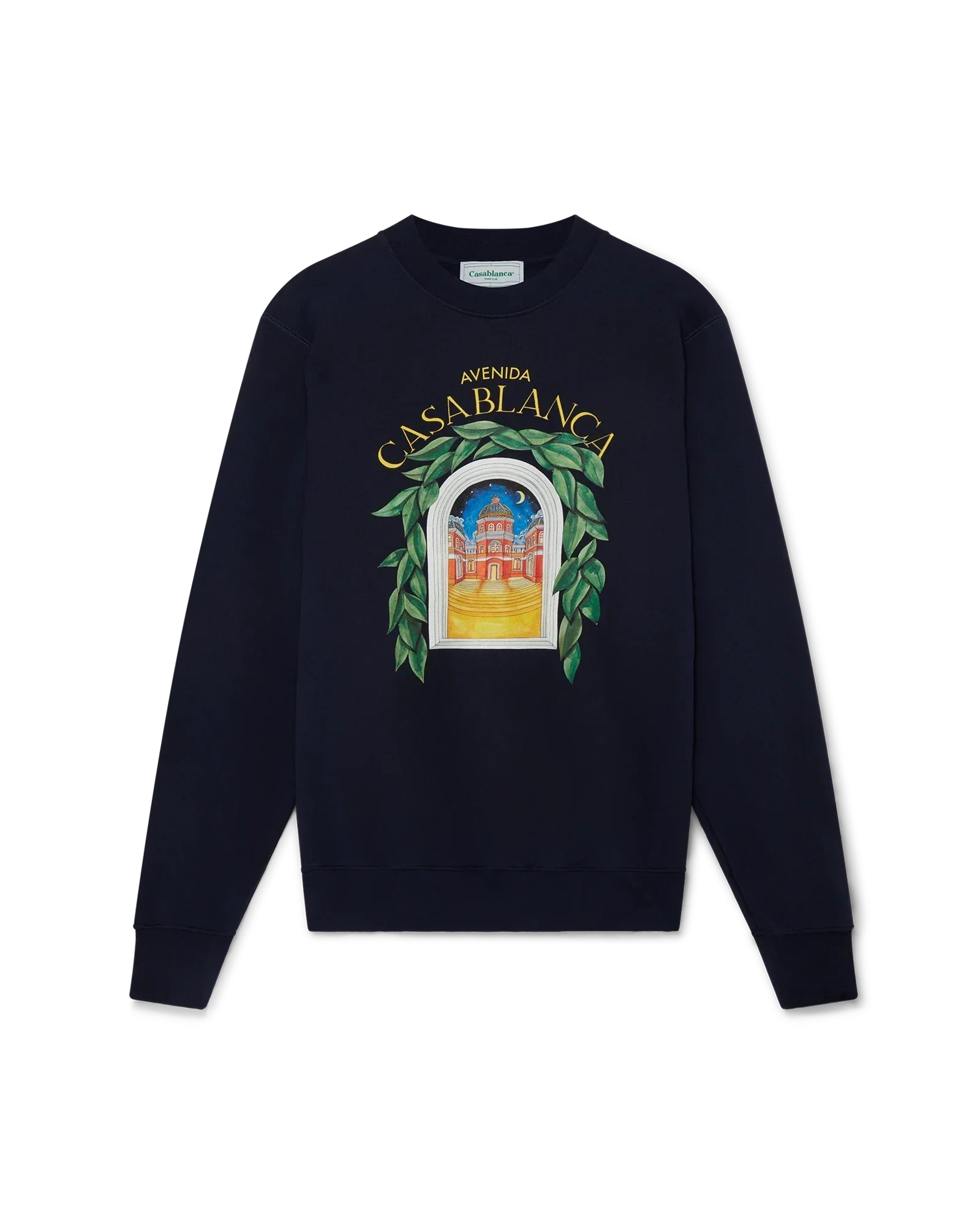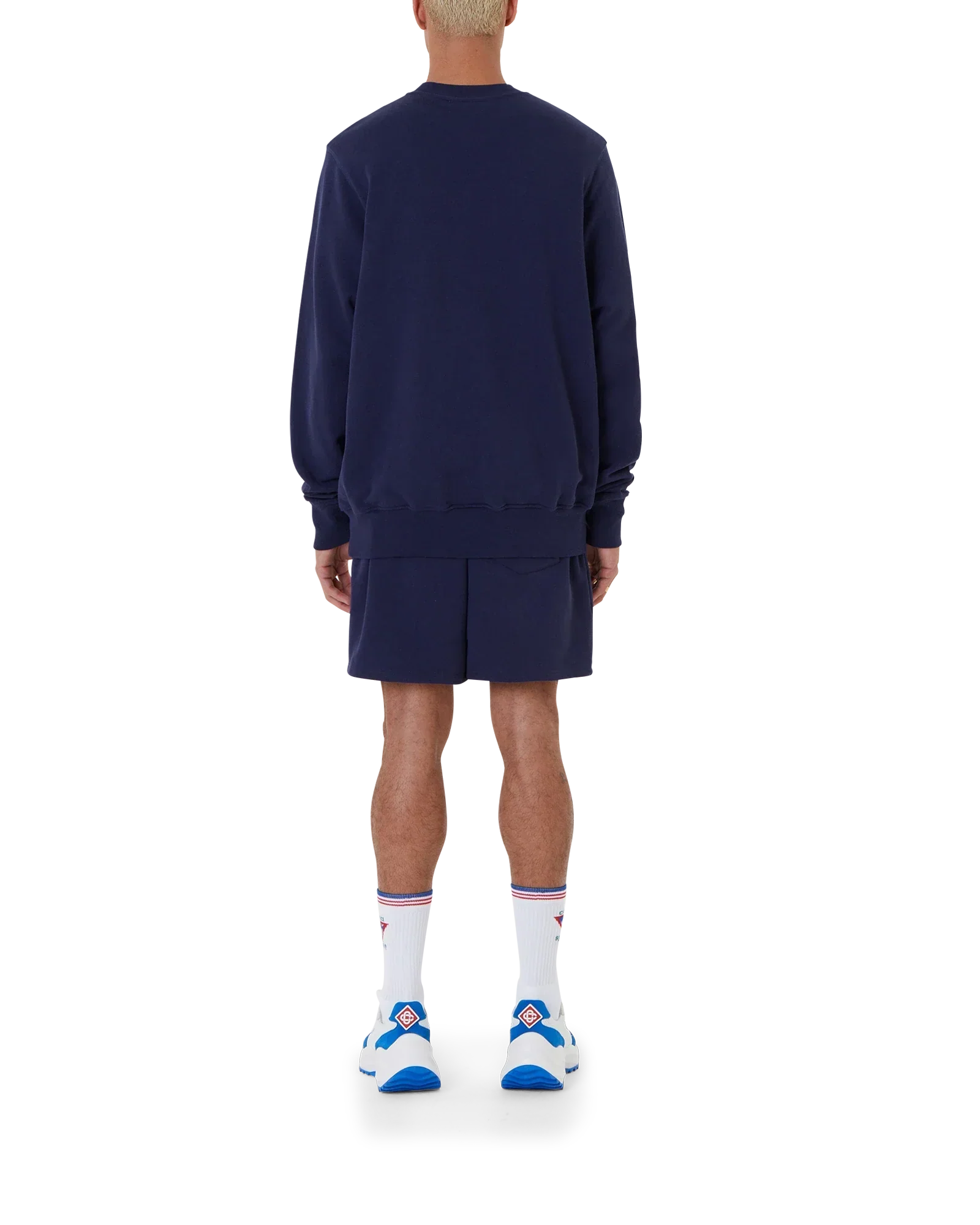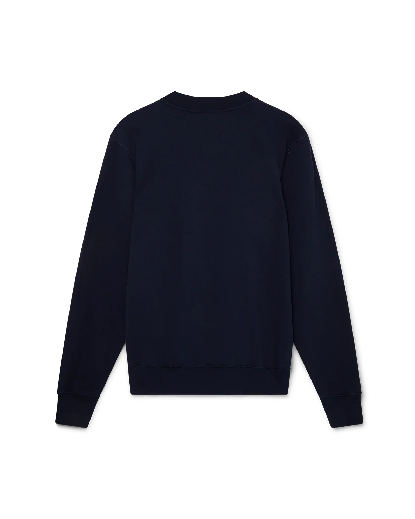 Organic cotton navy sweatshirt with screen-printed artwork.