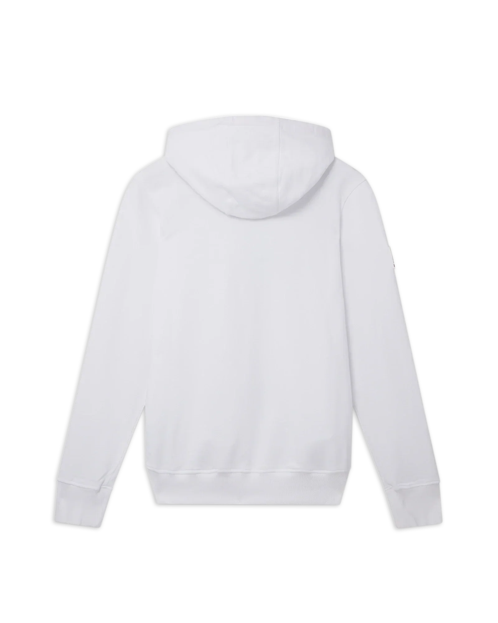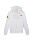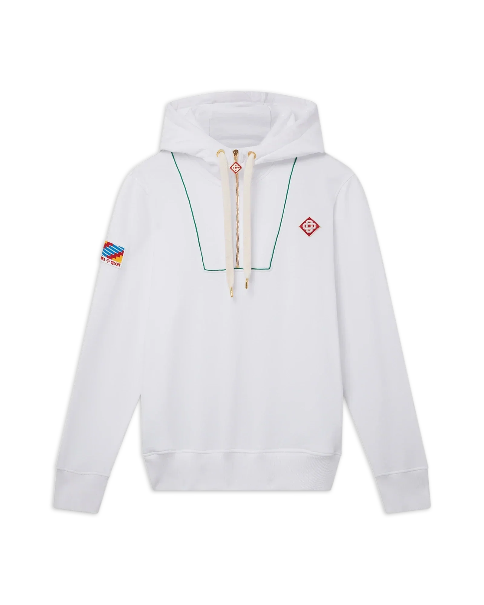 The white half zip hooded sweatshirt features the house's signature diamond monogram logo on the chest with contrast green piping on the front panel. Completed with a casa sport patch on the right sleeve and front zip closure.