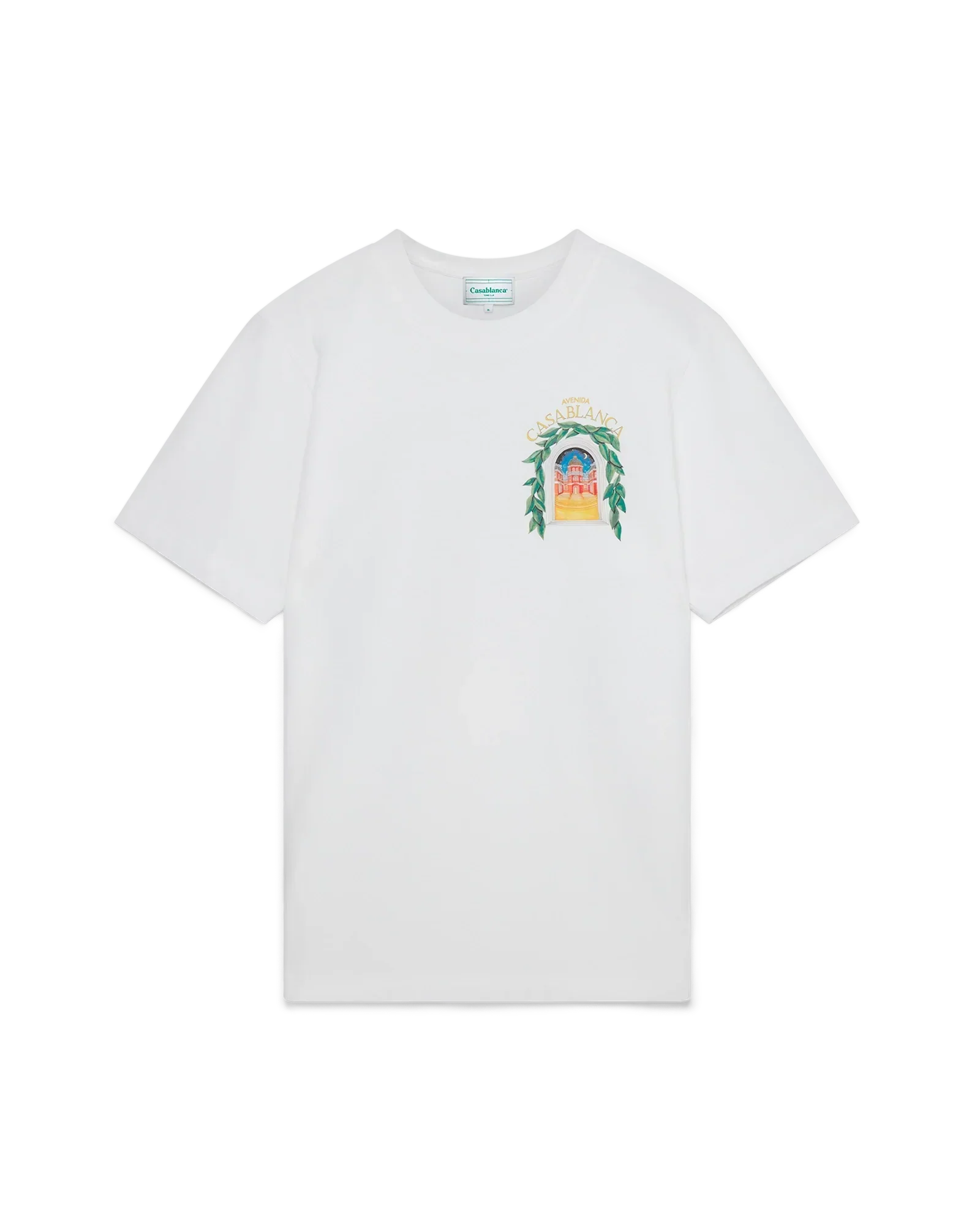 The Casablanca Avenida t-shirt in white features a seasonal screen-printed artwork where the free flow of nature meets the structure of manmade design The Arch, an abstract symbol of strength. Completed with a classic crewneck, short sleeves and Casablanca Paris branded label, designed for a relaxed fit.