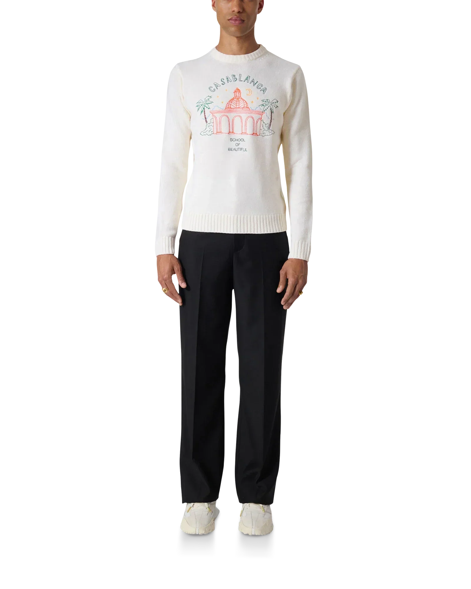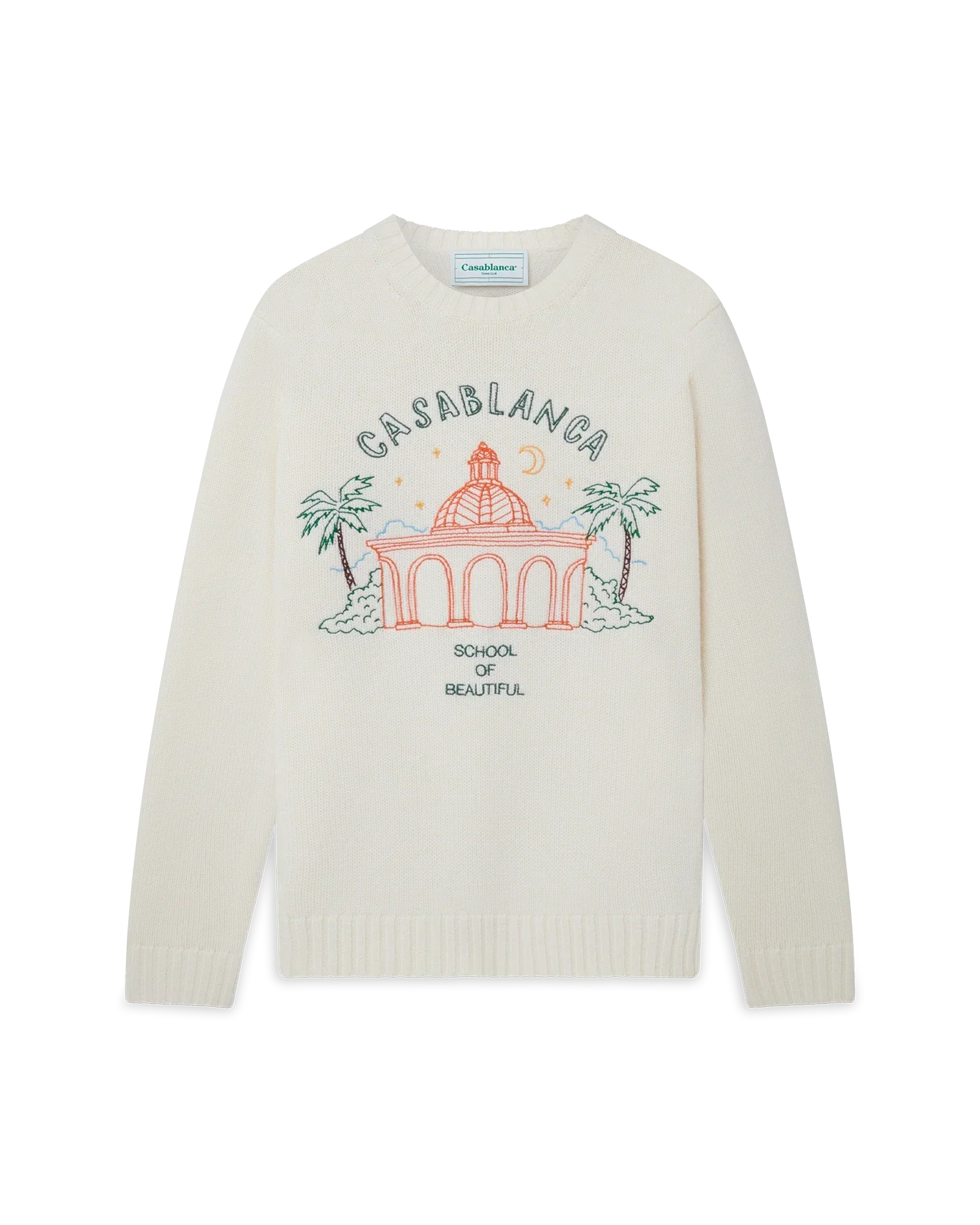 The School of Beautiful jumper is an off-white embroidered intarsia knit featuring the house's seasonal artwork across its front. Made from a luxurious mix of merino wool and cashmere, the style is a classic long-sleeved crew neck style and has been designed for a relaxed fit.