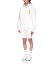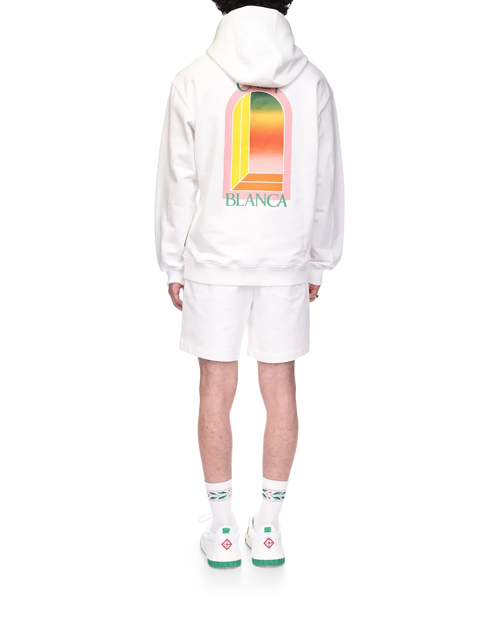 The Gradient L'Arche hooded sweatshirt is a printed design featuring the house's signature arch print in a gradient colourway of warm yellow, orange, pink and green, representative of the rich exchanges across cultural disciplines in African art, music and film. Crafted from a cotton blend fabric and completed with a hoodie, gold-tipped drawstring fastening, rib cuffs and hem.