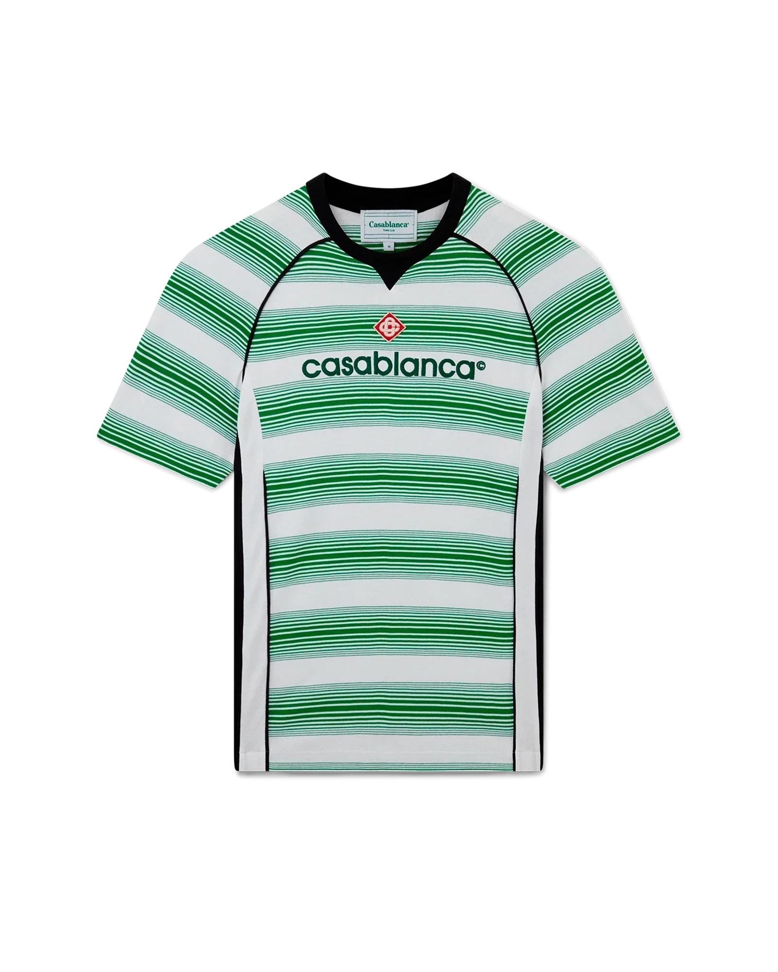 The Gradient Stripe panelled football t-shirt is a short-sleeve sportswear design, inspired by the colours of the Nigerian flag. Crafted from an organic cotton fabric and completed with the house's signature diamond logo, a Casablanca logo across the chest, and a classic crew neck.