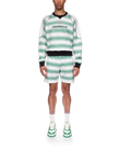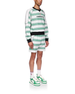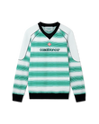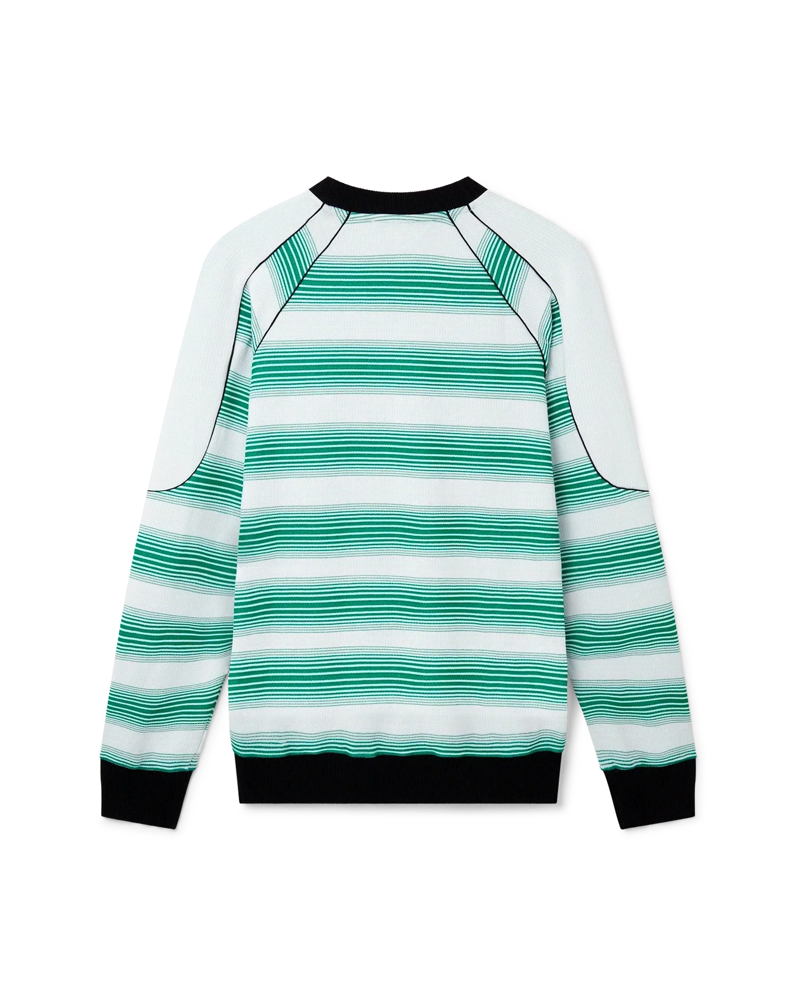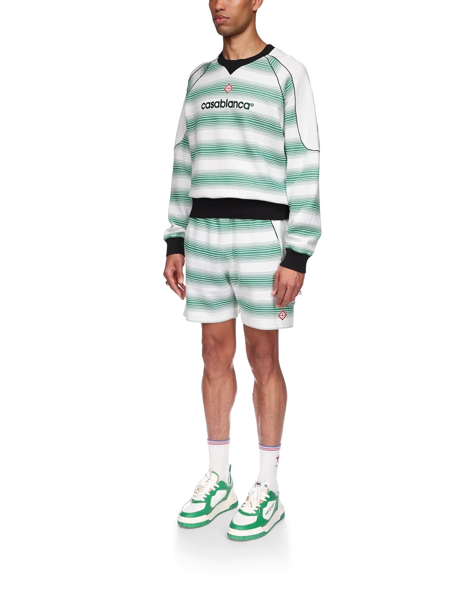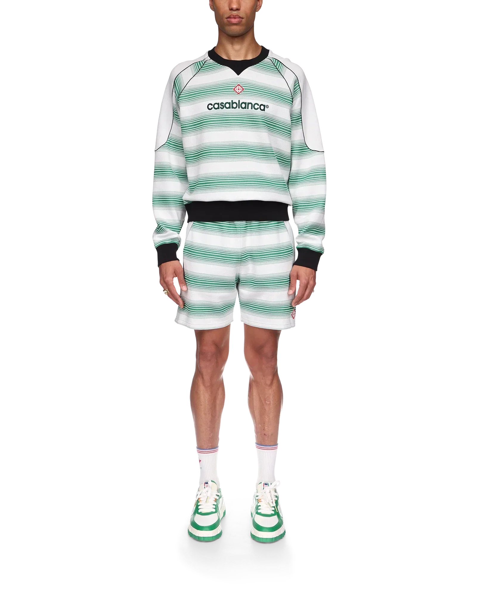 The gradient stripe sweatshirt is a long-sleeve sportswear design crafted from an interlock jacquard fabric and features the house's signature diamond and Casablanca logos on the chest, and is inspired by the colours of the Nigerian flag. Completed with a classic crew neck, white panels running from the collar to the elbows, contrast rib collar, cuffs and hem.