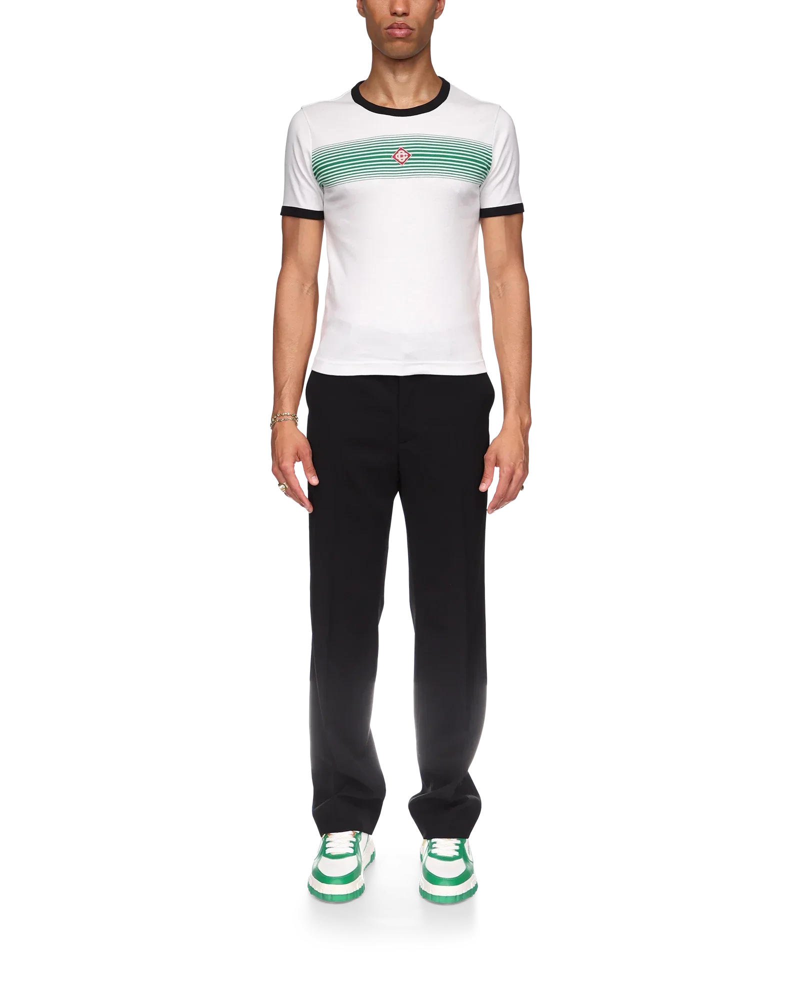 The Gradient Stripe ringer t-shirt is a fitted design inspired by the colours of the Nigerian flag and featuring the house's diamond logo appliqué. Crafted from an organic cotton fabric and finished with a classic crew neck, with a contrast rib collar and cuffs.
