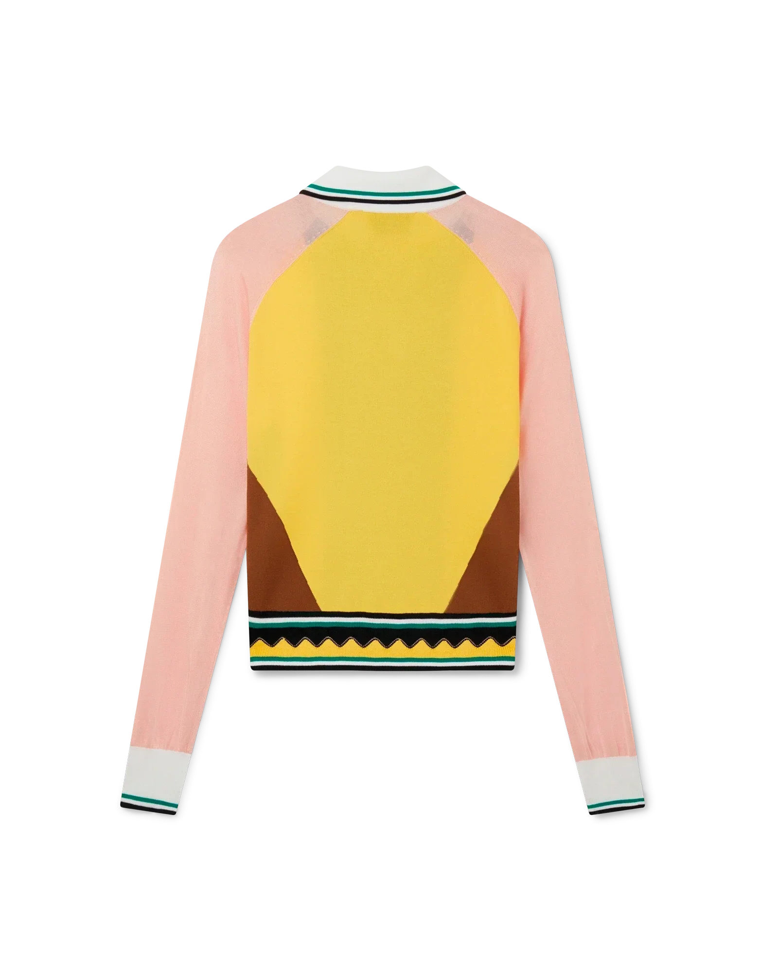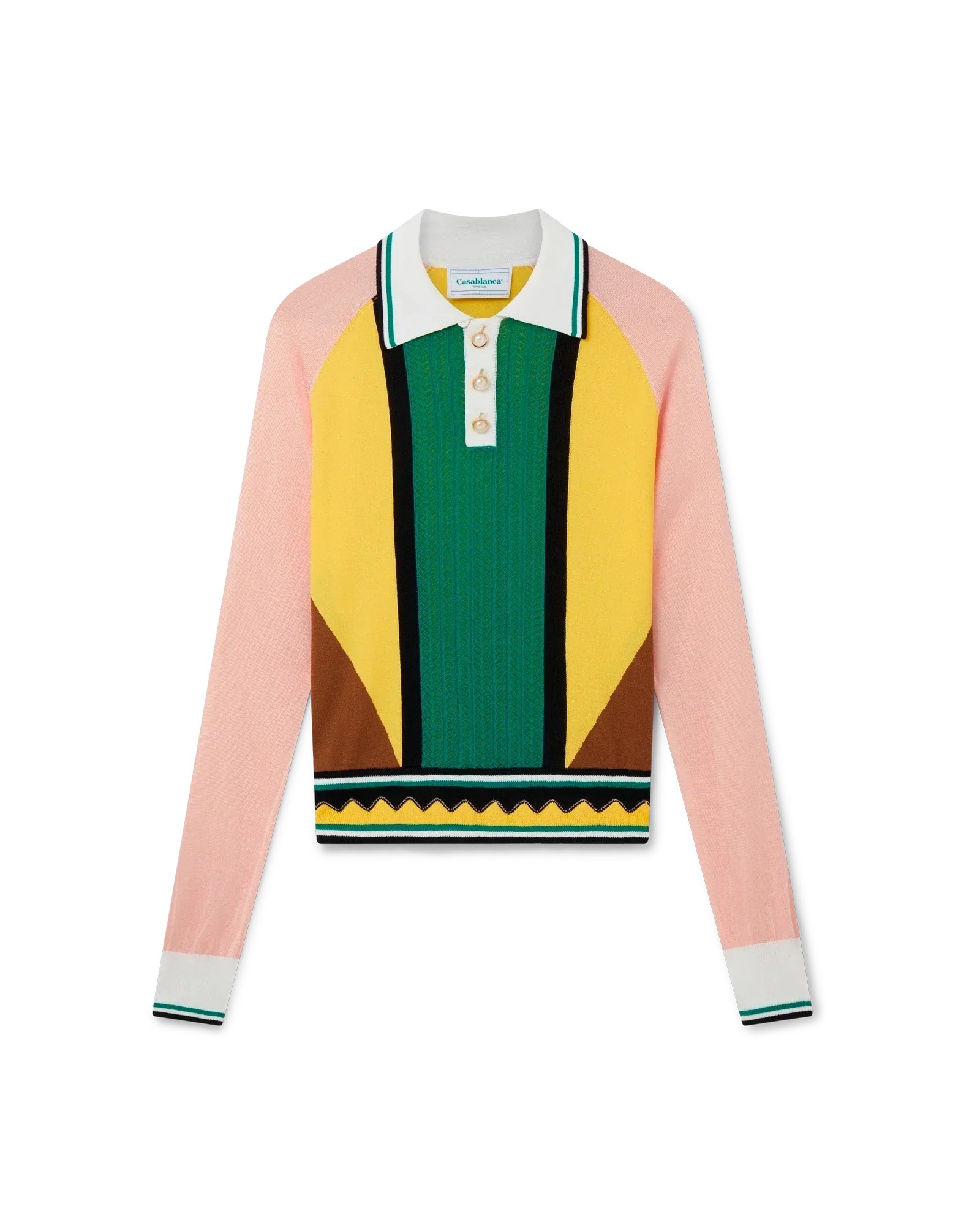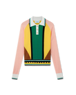 The graphic panelled polo shirt is a long-sleeve design inspired by Nigeria and features the colours of the country's flag. Completed with panel colour blocks, the house's signature gold rim pearl buttons, rib collar, cuffs, and hem with striped details.