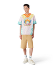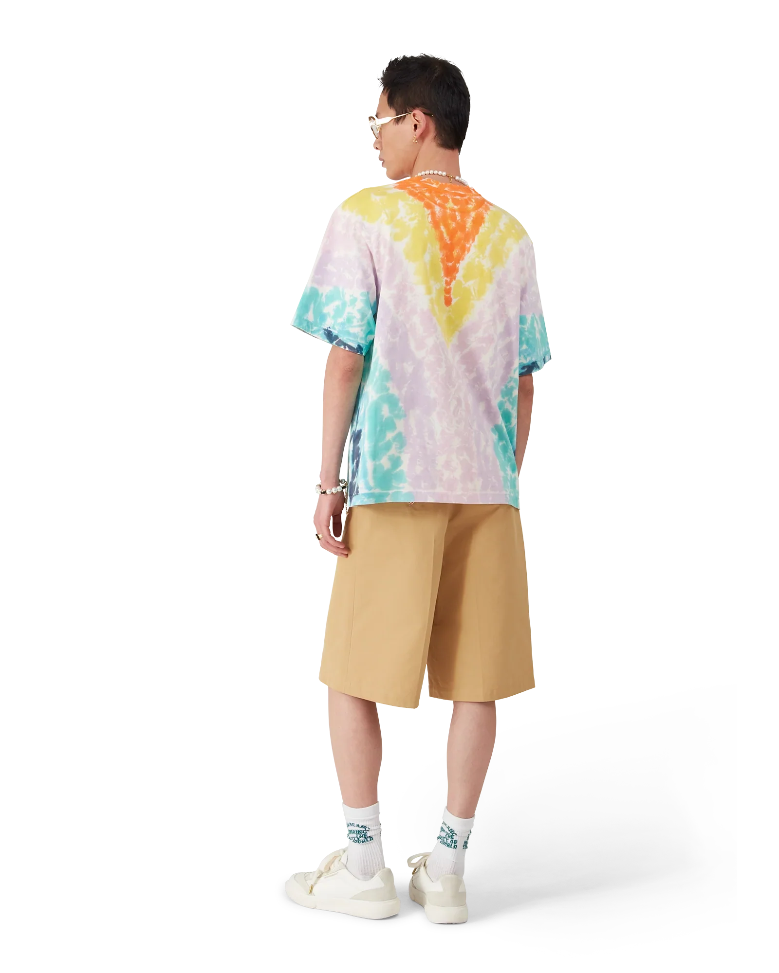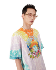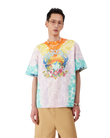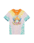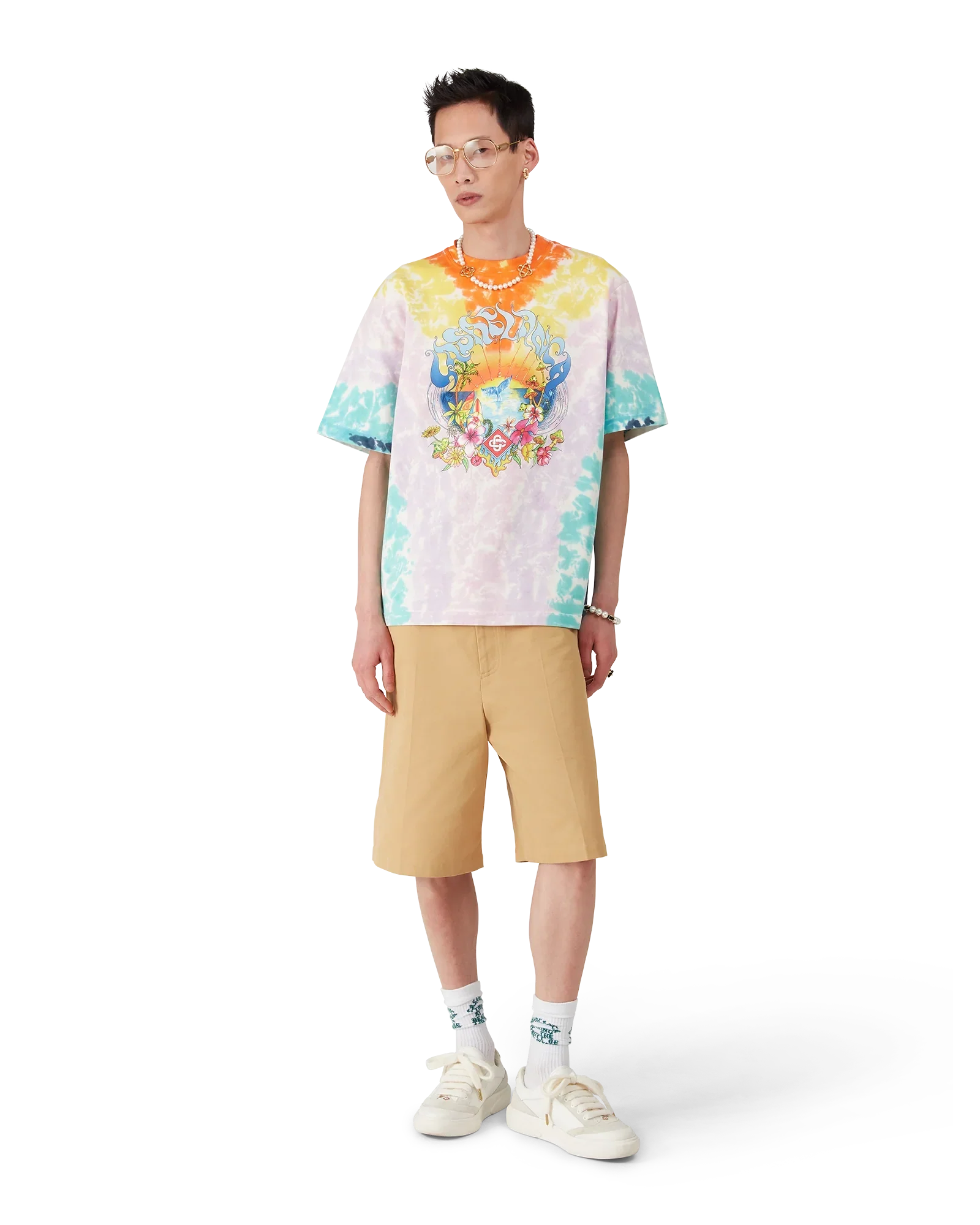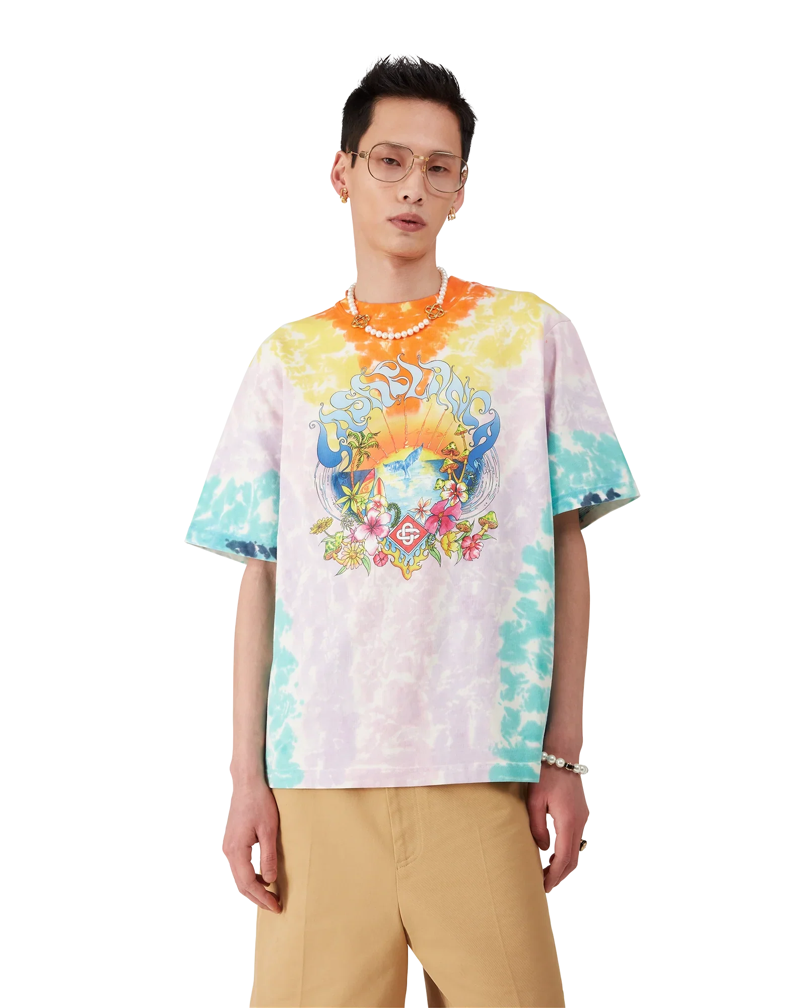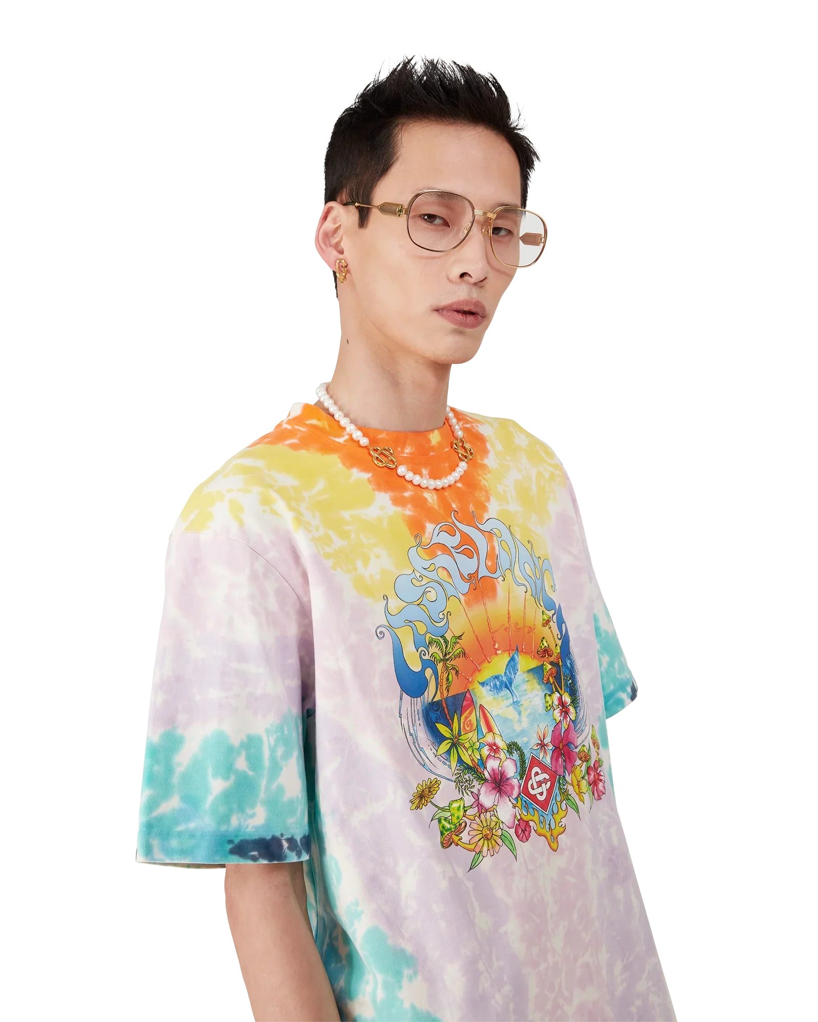 The Surf Trip tie-dye t-shirt is a short-sleeve printed design crafted from organic cotton fabric featuring seasonal artwork inspired by vintage Malibu surf culture using typography from that era, on a tie-dye backdrop referencing hippy culture. Completed with a classic crew neck.