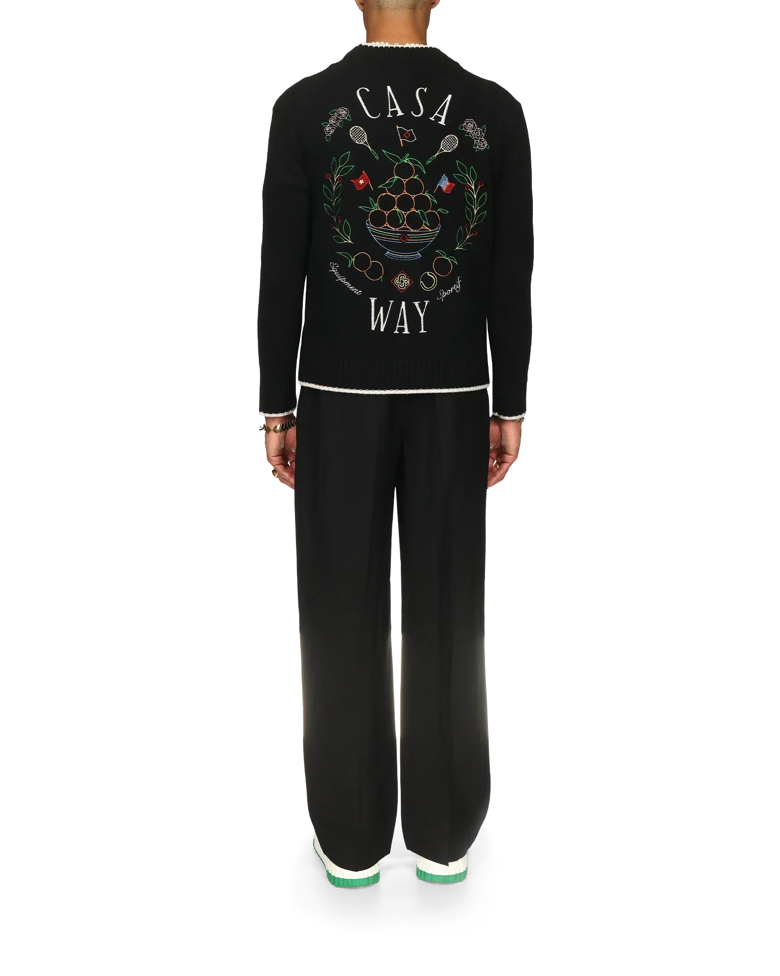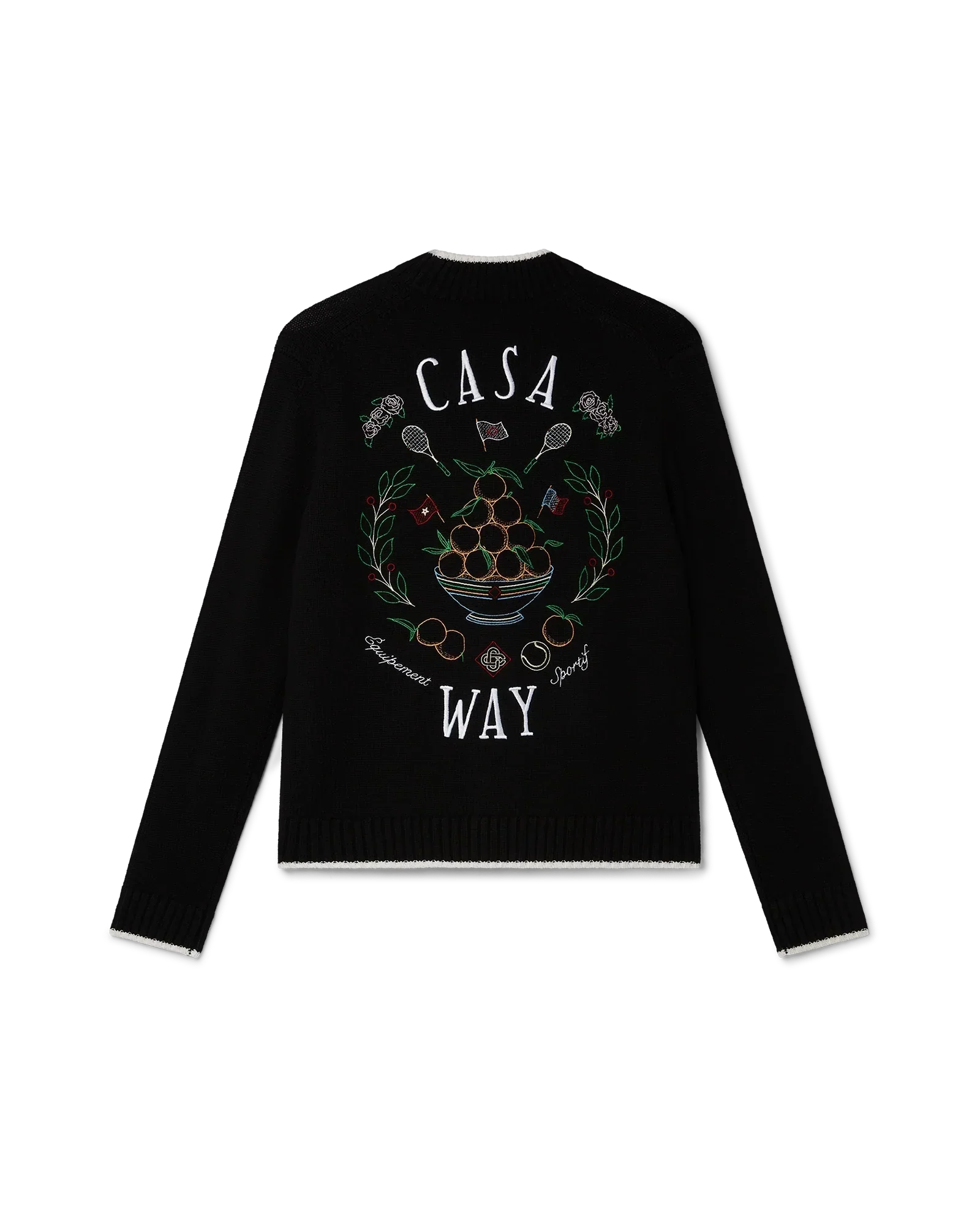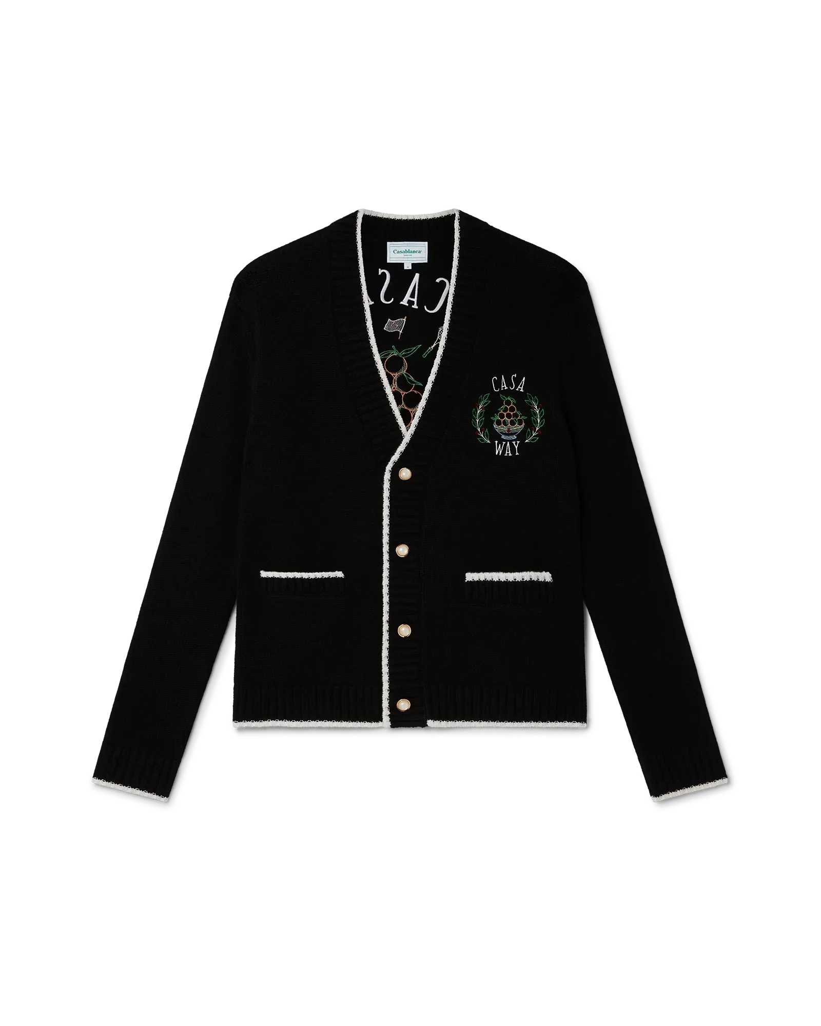 The Casa Way cardigan is a v-neck knitted style crafted from a cashmere blended fabric featuring the house's classic iconographic artwork of the orange pyramid, tennis rackets and floral design on the back. Finished with our signature gold rim pearl buttons, and white detailing on the collar, cuffs, hem and pockets.