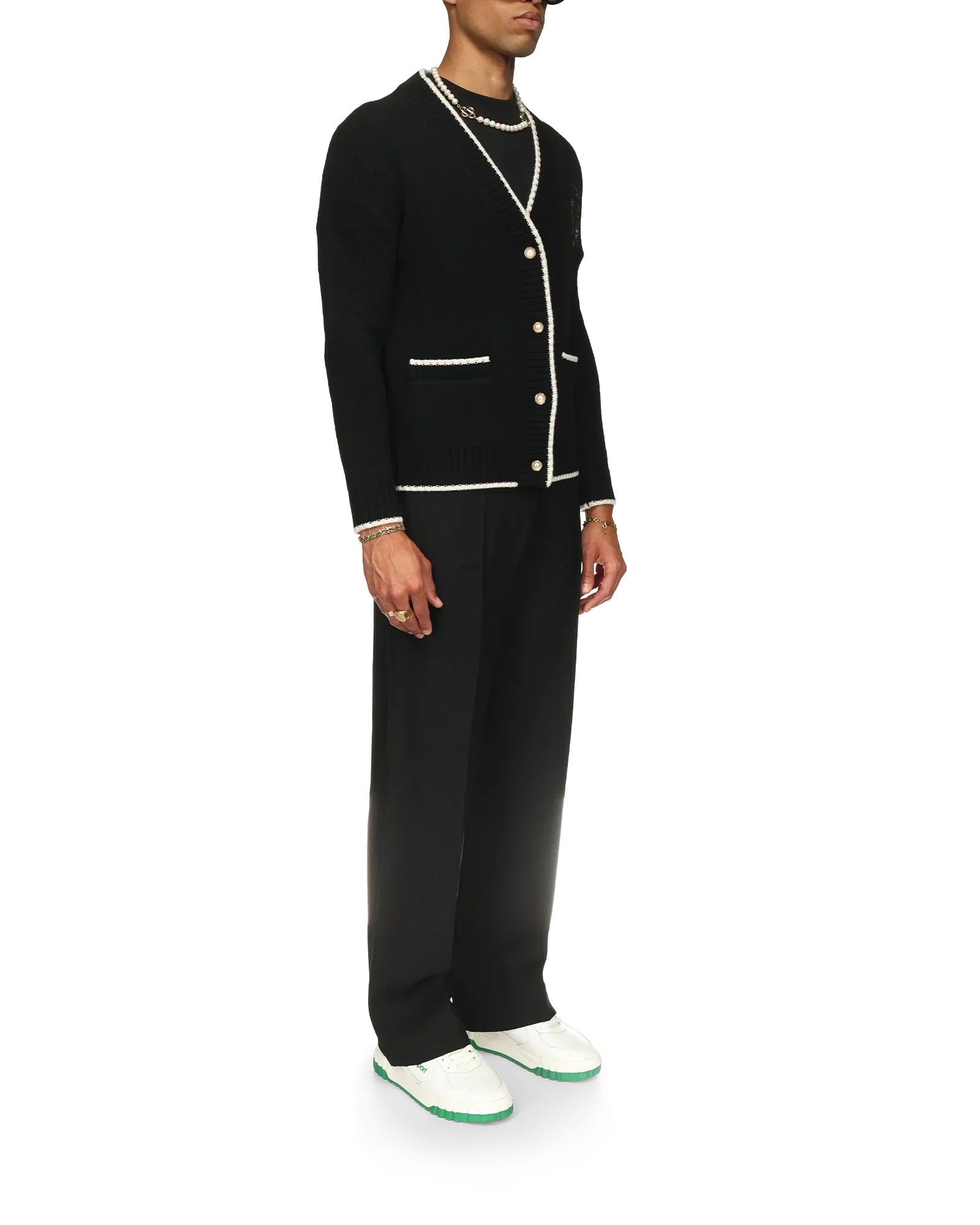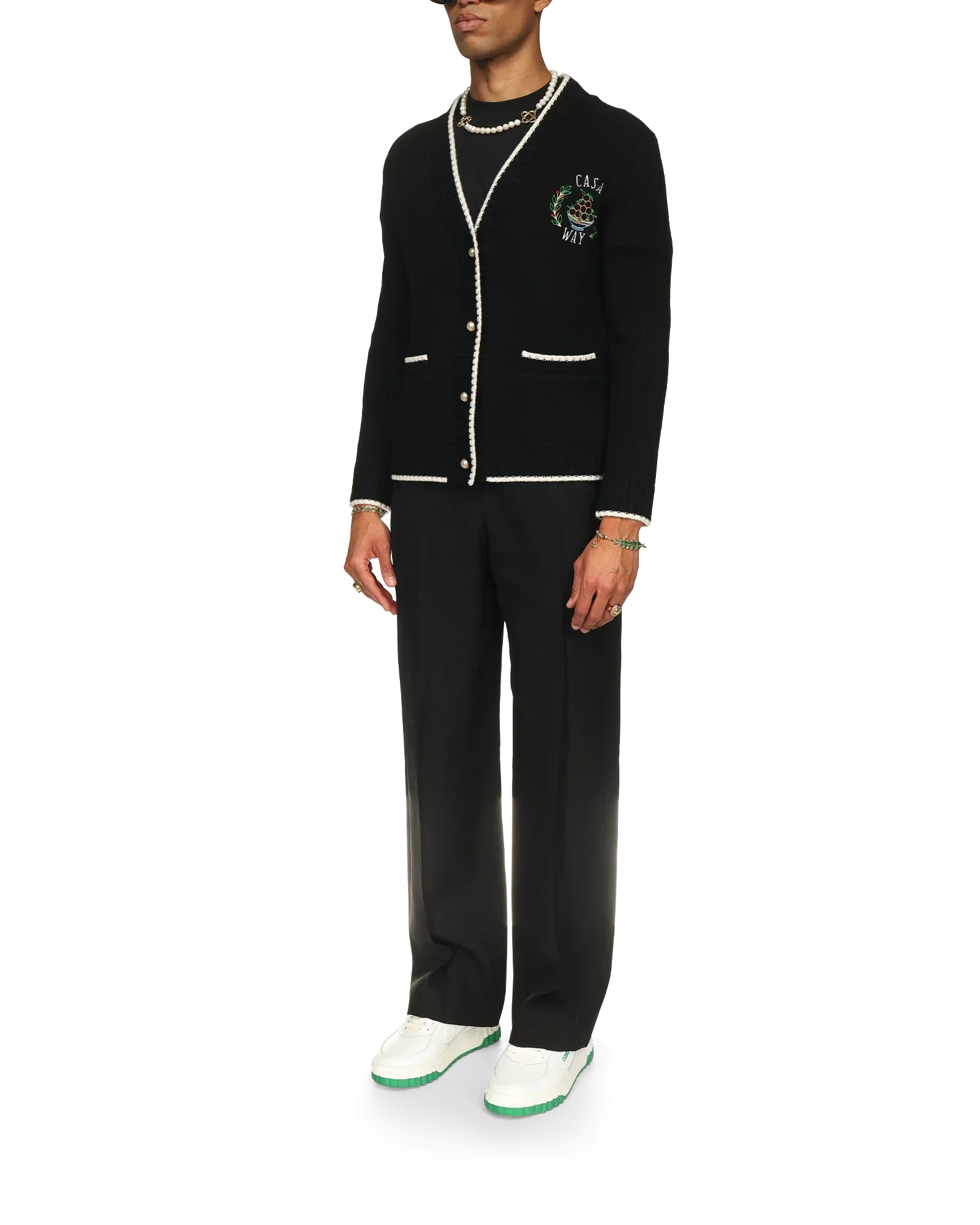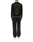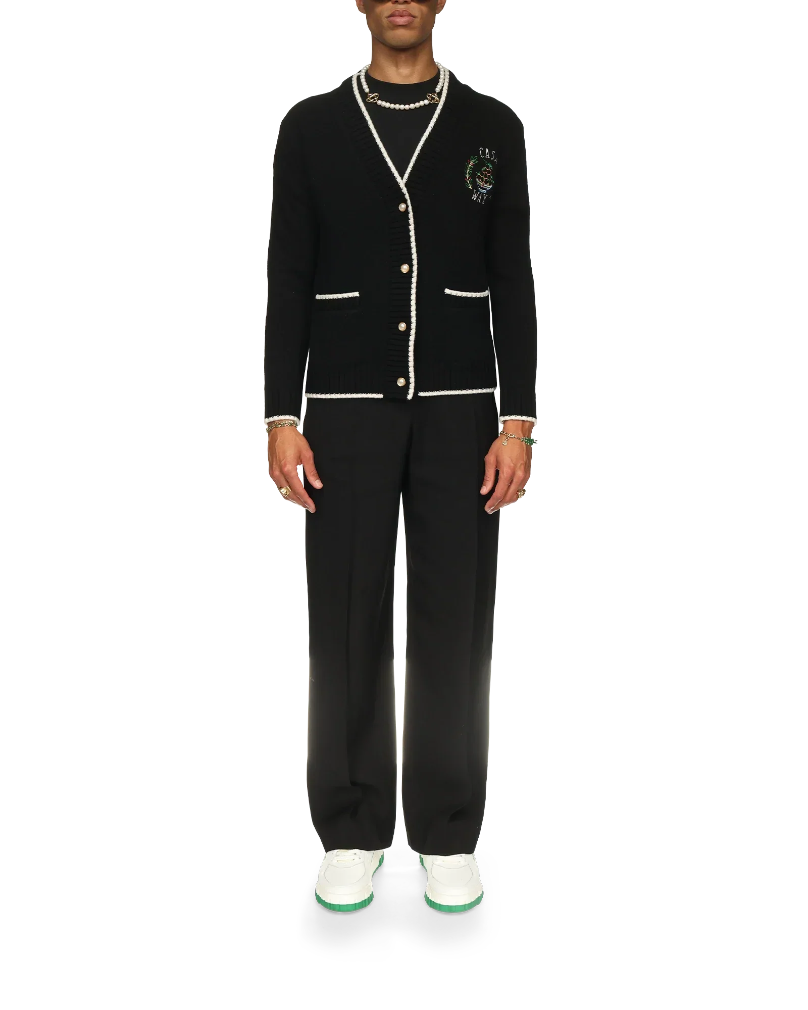 The Casa Way cardigan is a v-neck knitted style crafted from a cashmere blended fabric featuring the house's classic iconographic artwork of the orange pyramid, tennis rackets and floral design on the back. Finished with our signature gold rim pearl buttons, and white detailing on the collar, cuffs, hem and pockets.