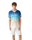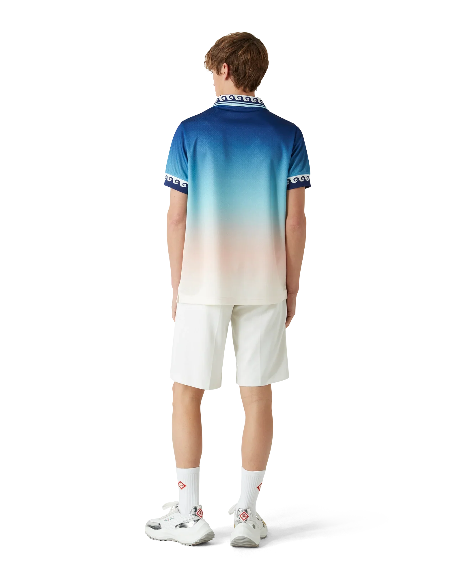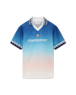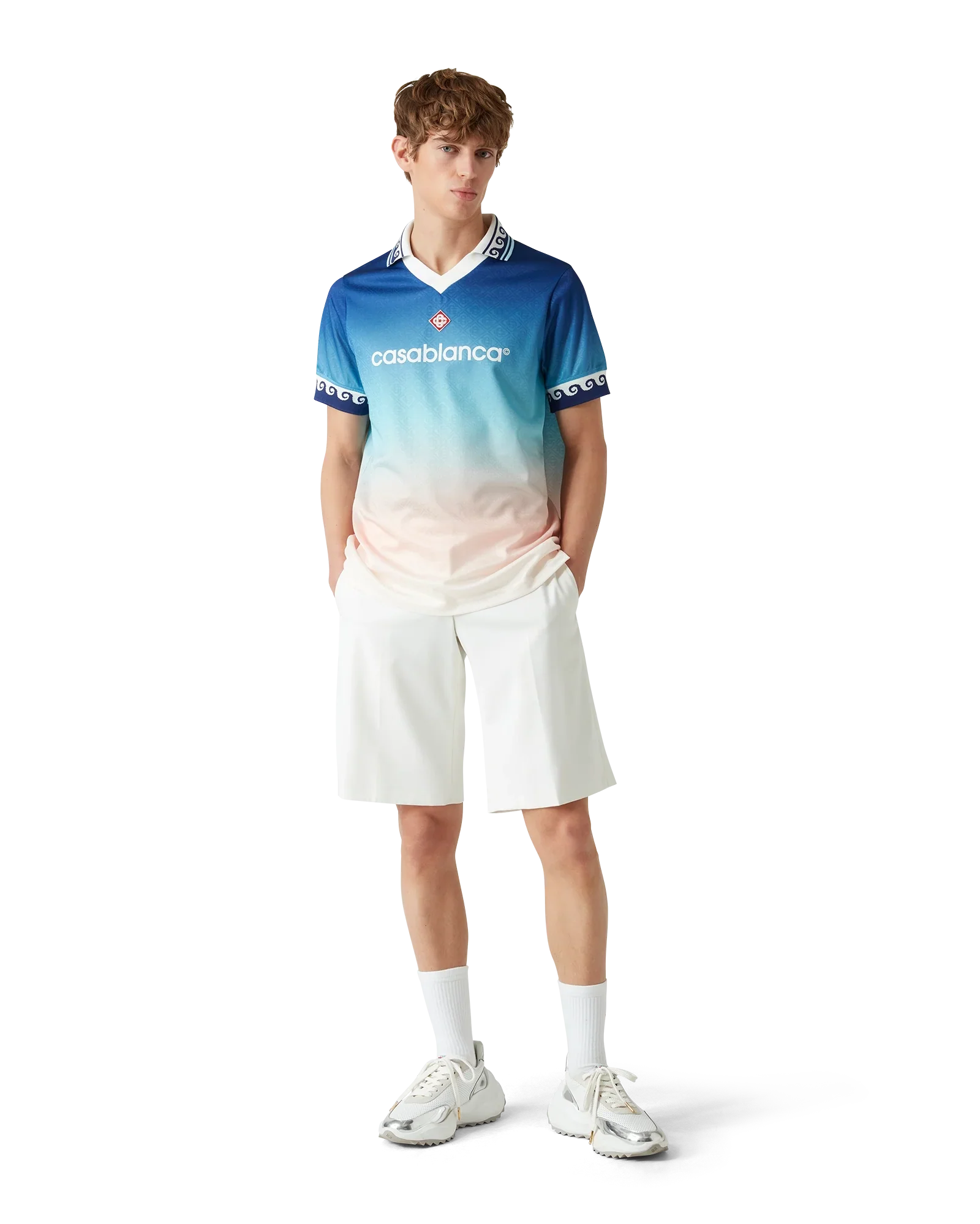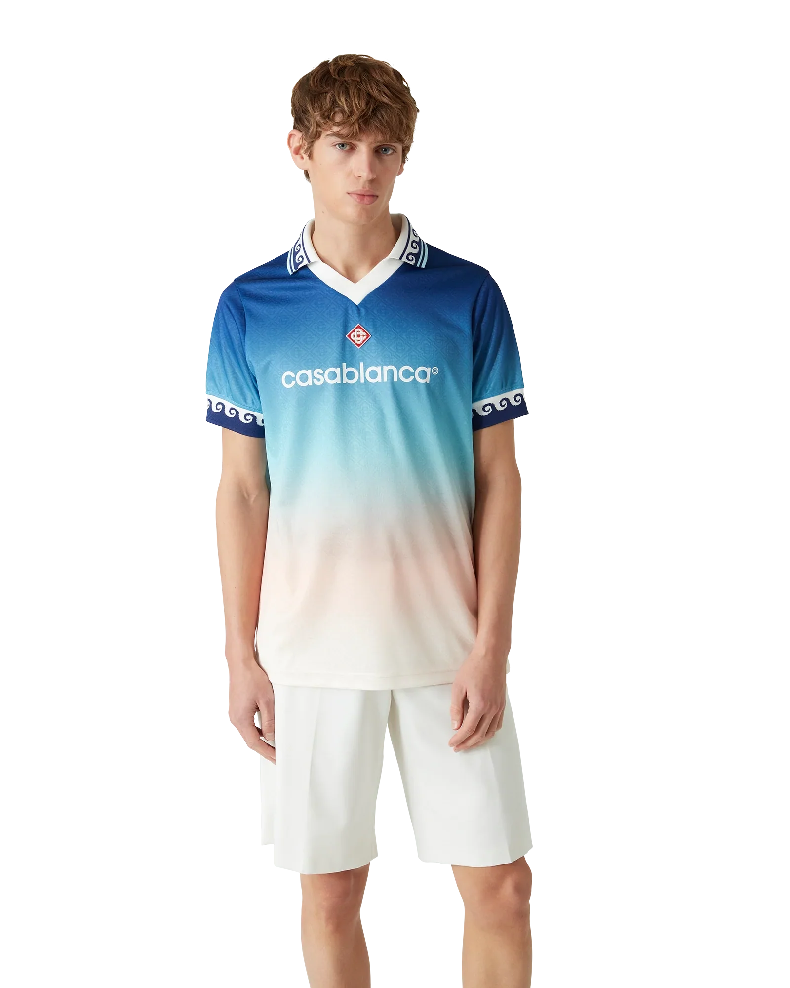 The Jacquard monogram football shirt is a short-sleeve sportswear design featuring the house's signature diamond monogram. Crafted from a gradient jacquard monogram fabric and completed with the house's signature diamond logo patch, a contrast rib collar, and a Casablanca logo across the chest.