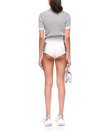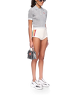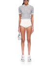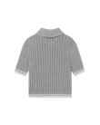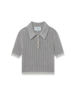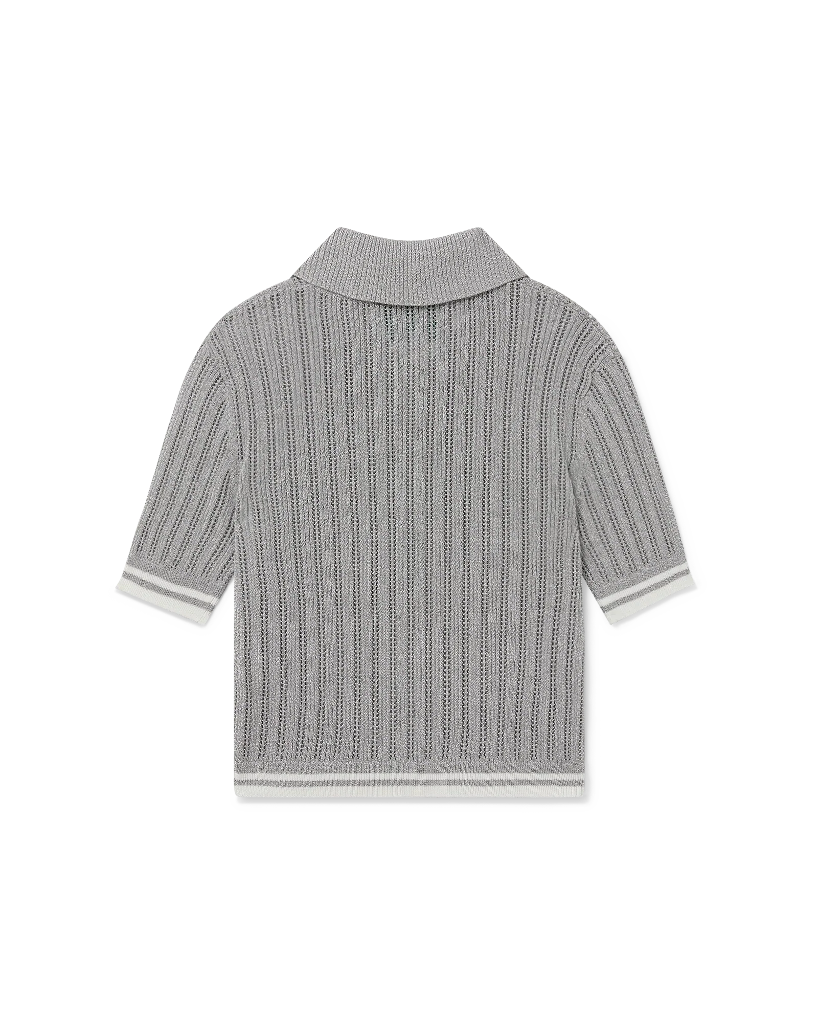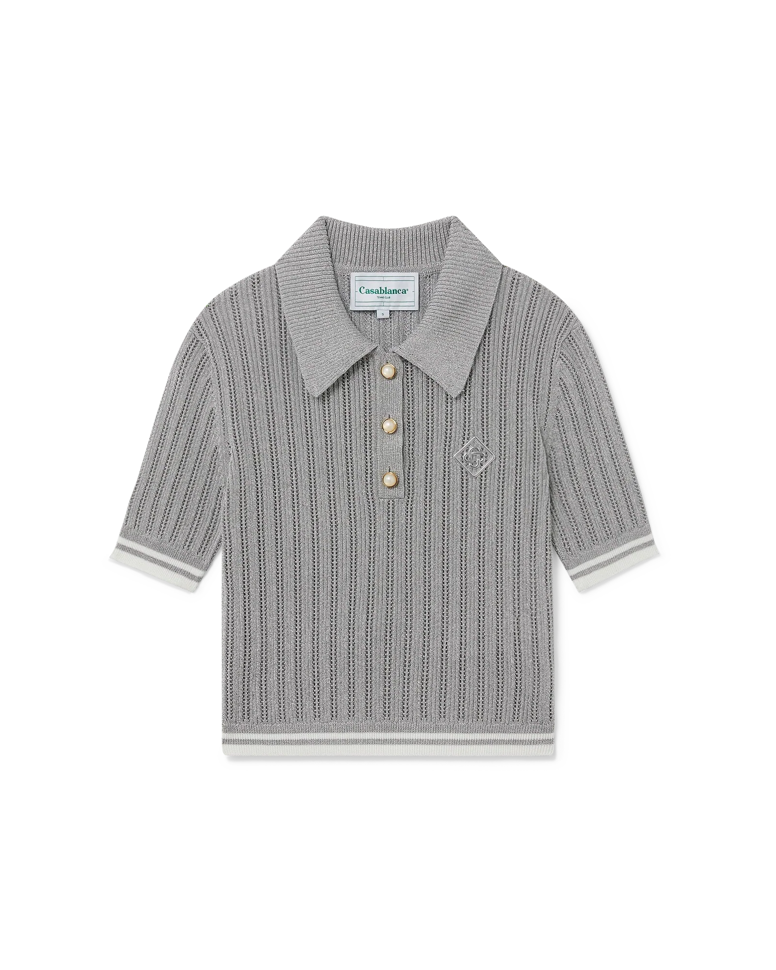 The silver short-sleeve polo is a short style crafted from a knitted metallic poly blend fabric, featuring the house's diamond logo in a transparent polyurethane design. Completed with the house's signature gold-rim pearl buttons, stripe detail on the cuffs and hem, and rib collar, cuffs, hem and placket.