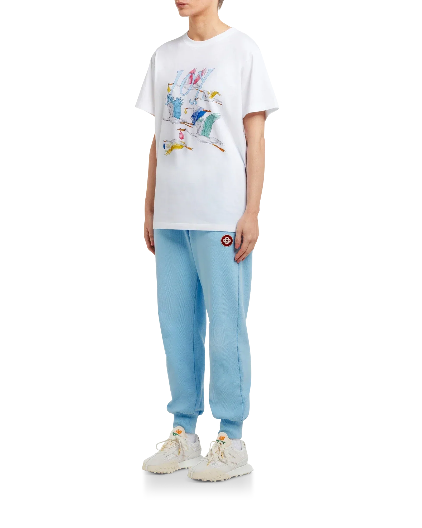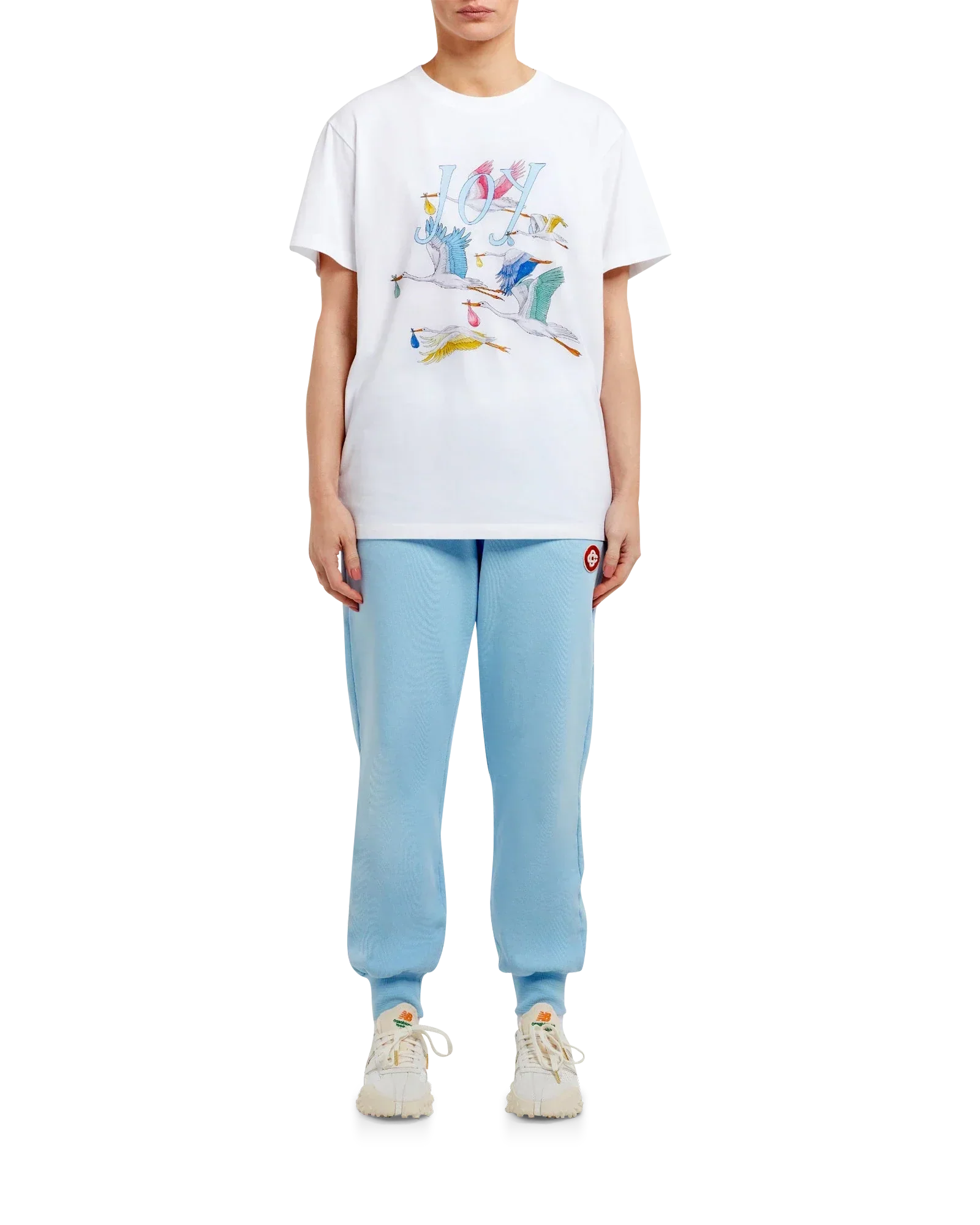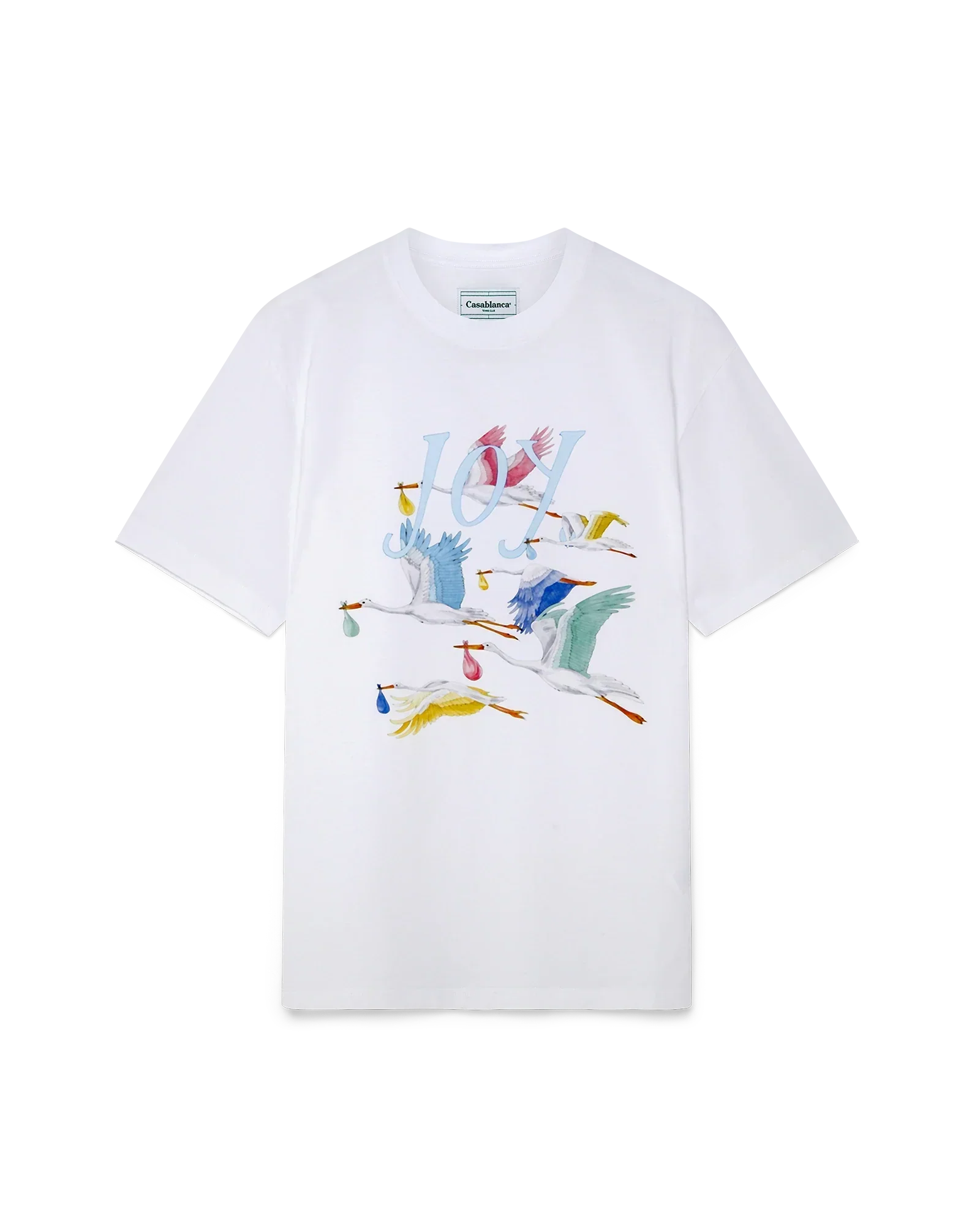 The Delivering Joy women's t-shirt features screen-printed seasonal artwork. Crafted from 100% cotton and completed with a classic crewneck, short sleeves and Casablanca Paris branded label.