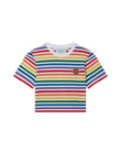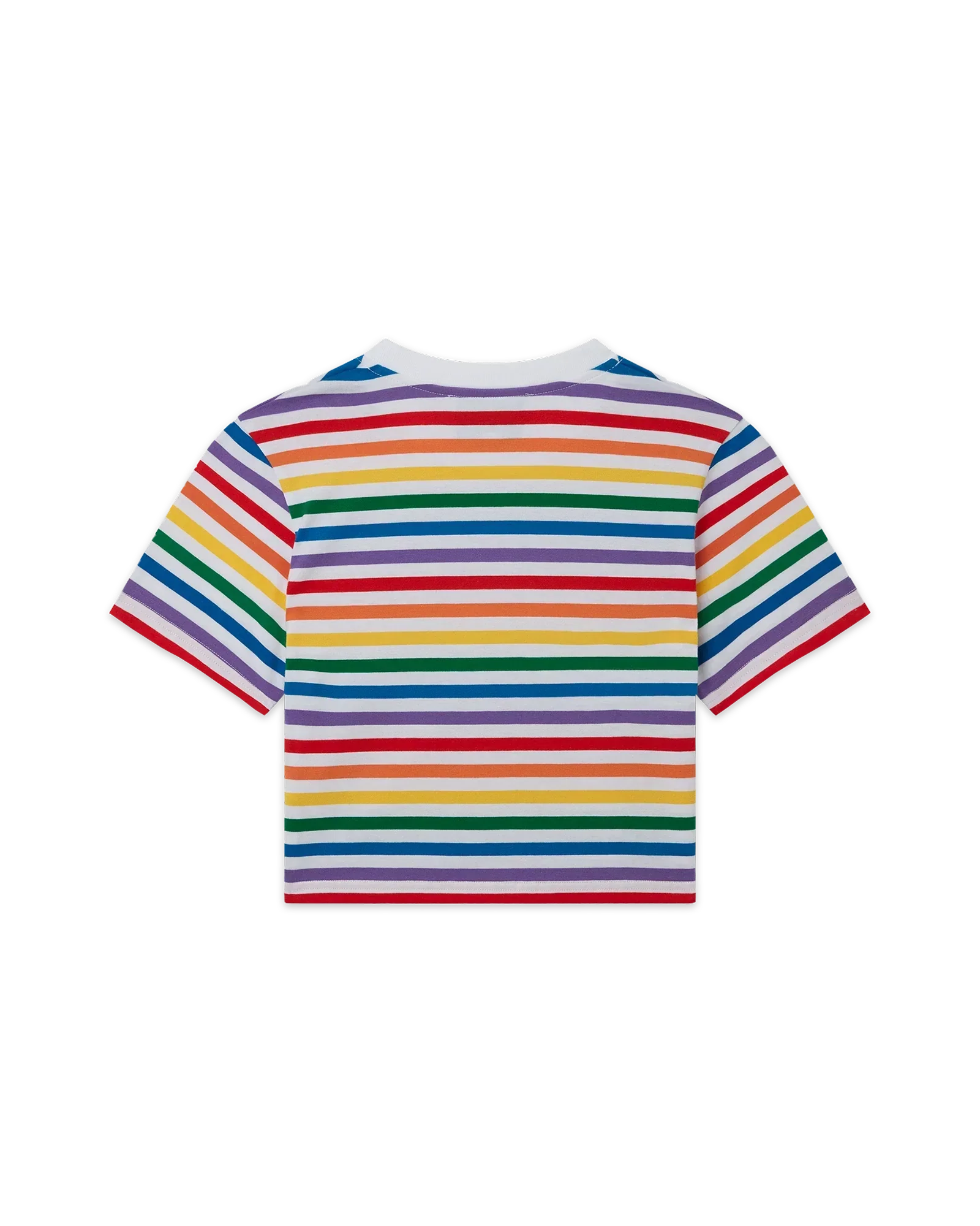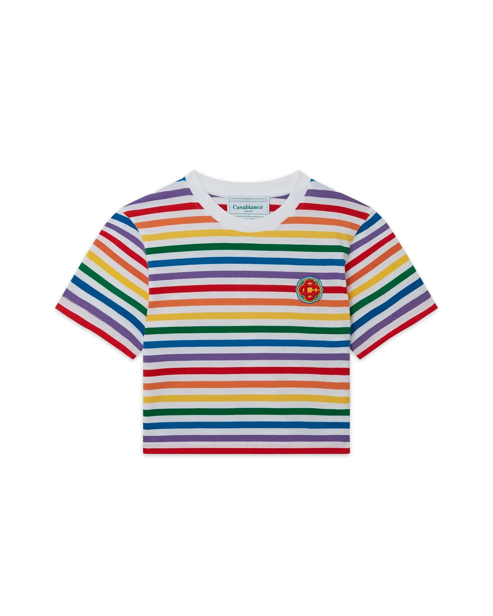 The Rainbow Stripe cropped organic cotton women's t-shirt features a seasonal striped design. Completed with a classic crewneck, short sleeves and Casablanca Paris branded label.