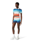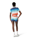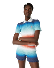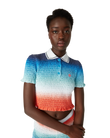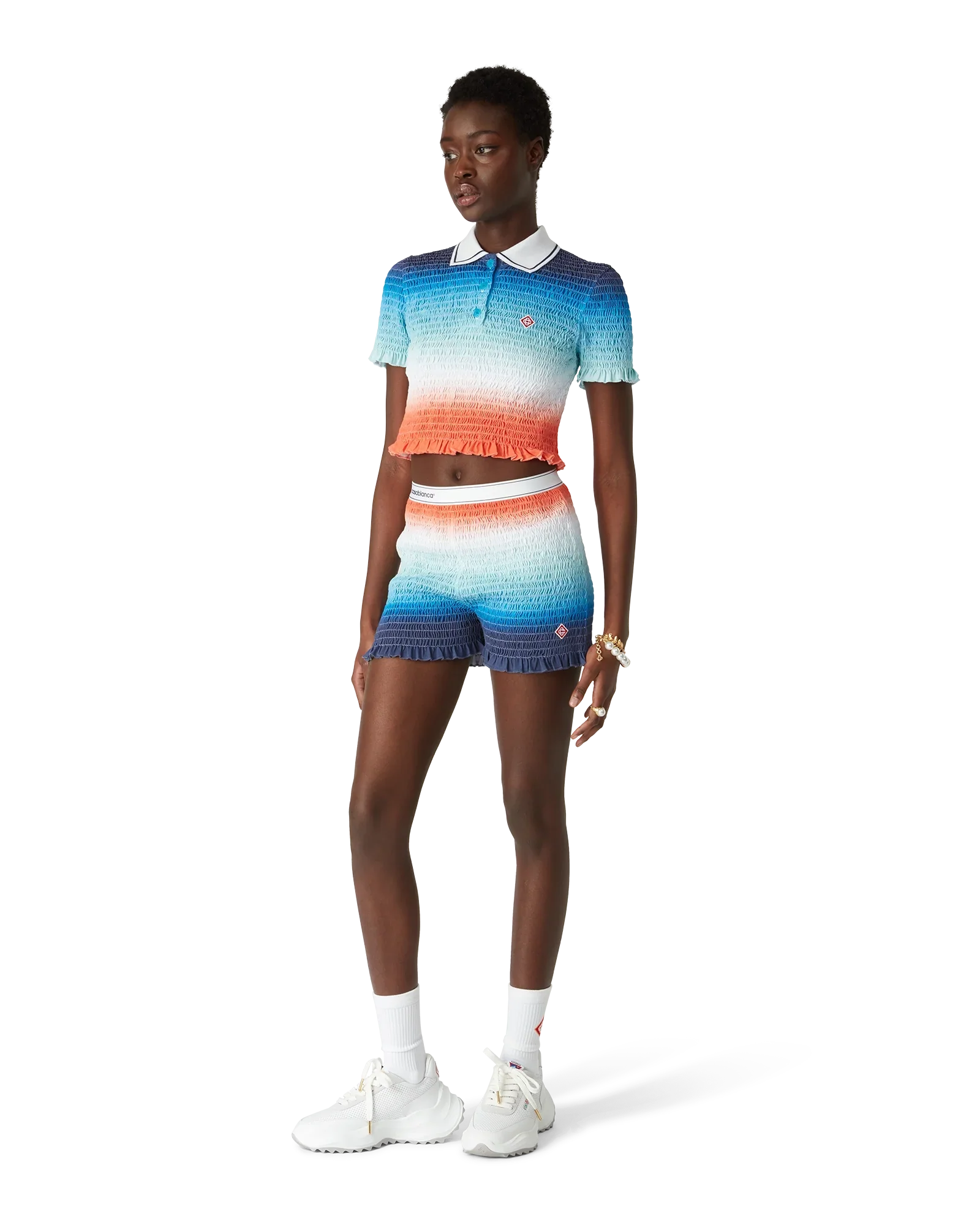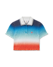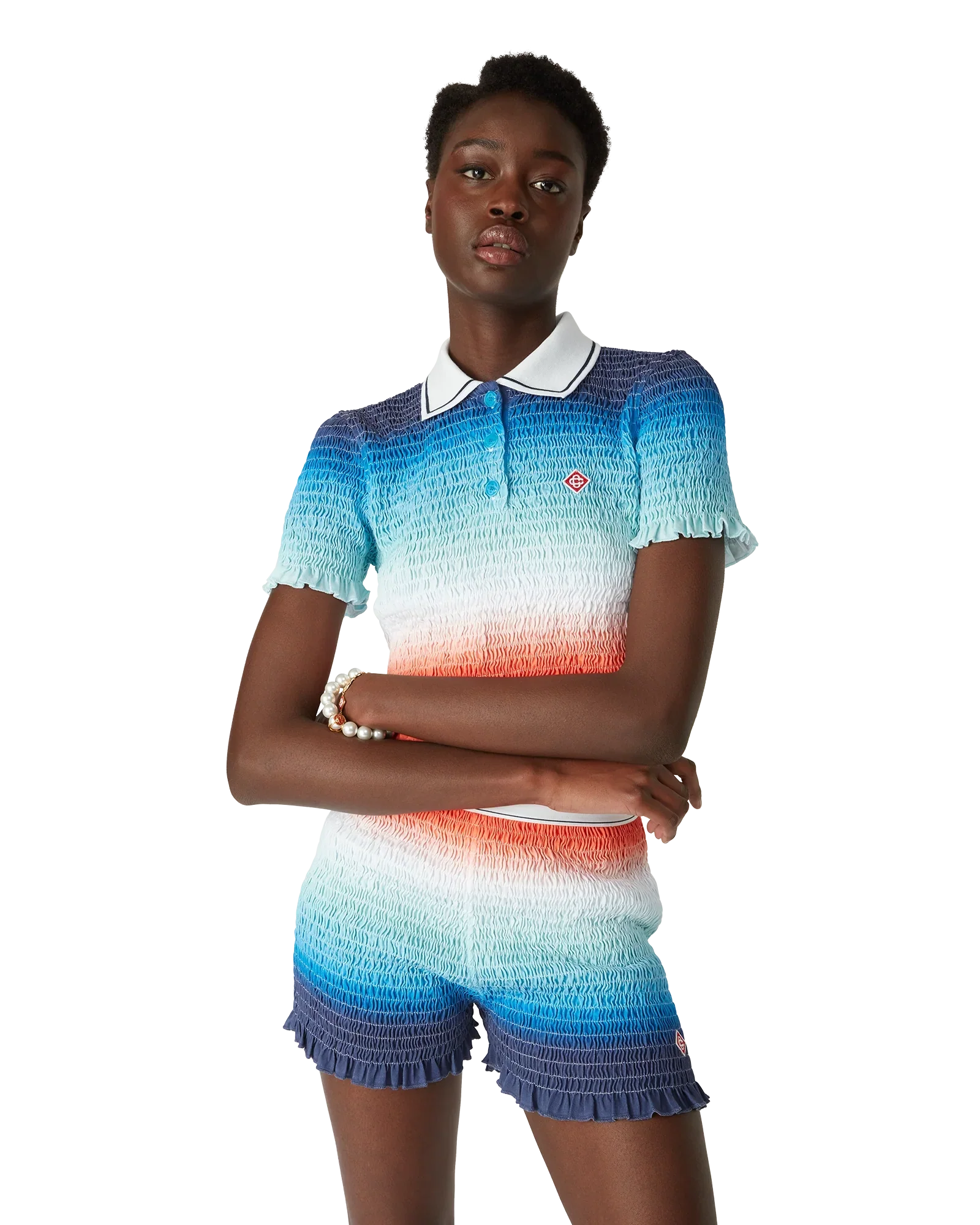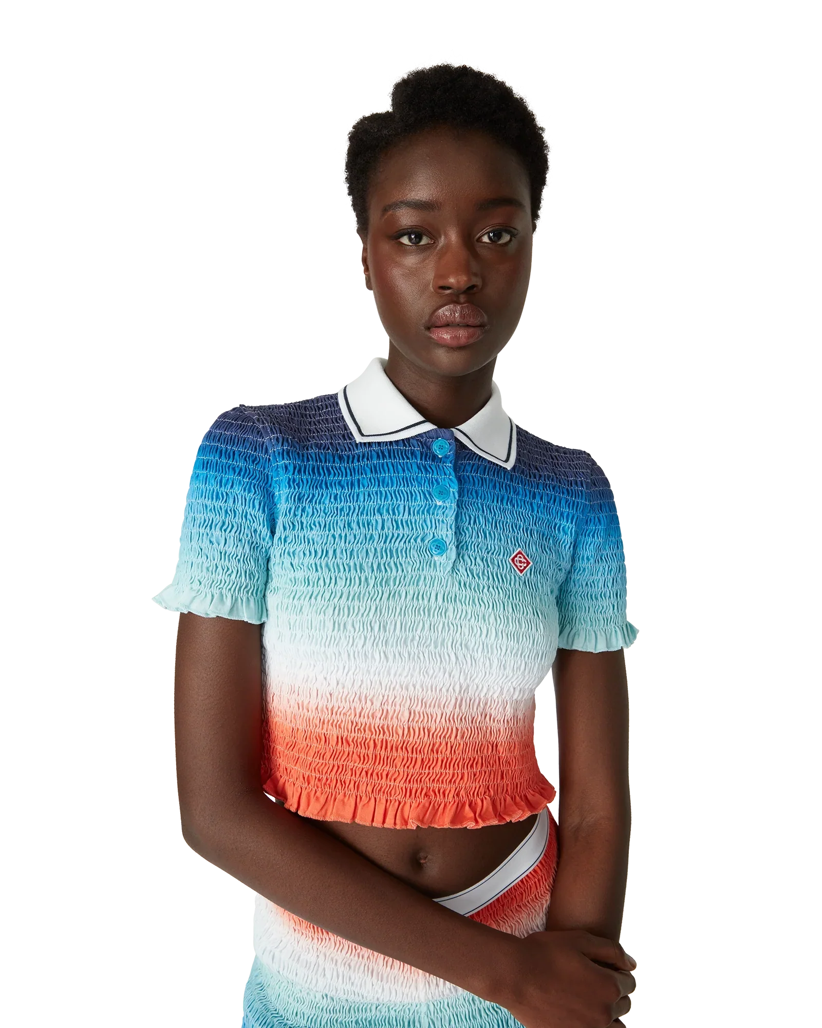 The gradient cropped polo shirt is an all-over printed short style featuring the house's seasonal vibrant gradient print of deep inky blues transitioning through shades of pink to vibrant orange, representing the summer’s shifting sky, sinking into the ocean’s horizon, alluding to nature’s ever-changing canvas, and the house's signature diamond logo. Crafted from shirred cotton fabric and completed with a contrast collar with edge detail, three-button placket closure, short sleeves, and frill details on the cuffs and hem. Designed to fit above the navel.